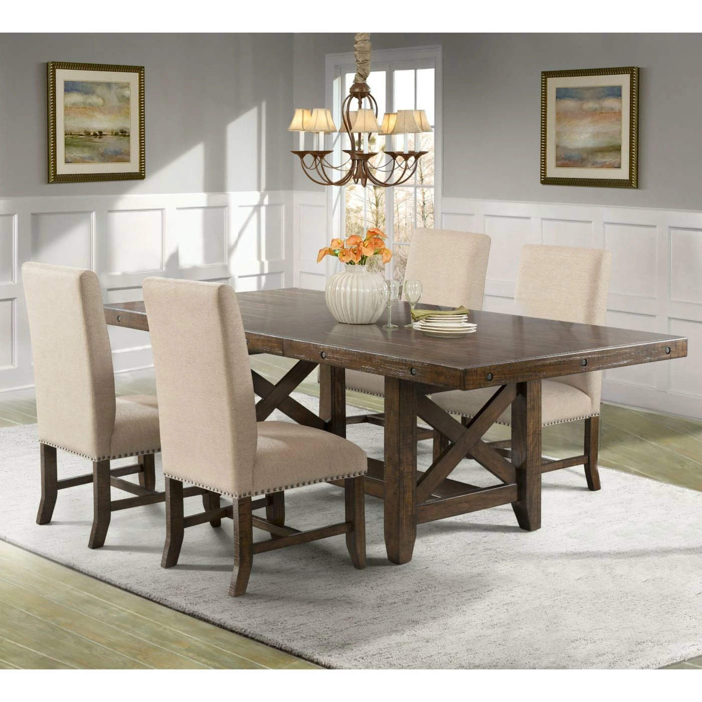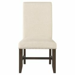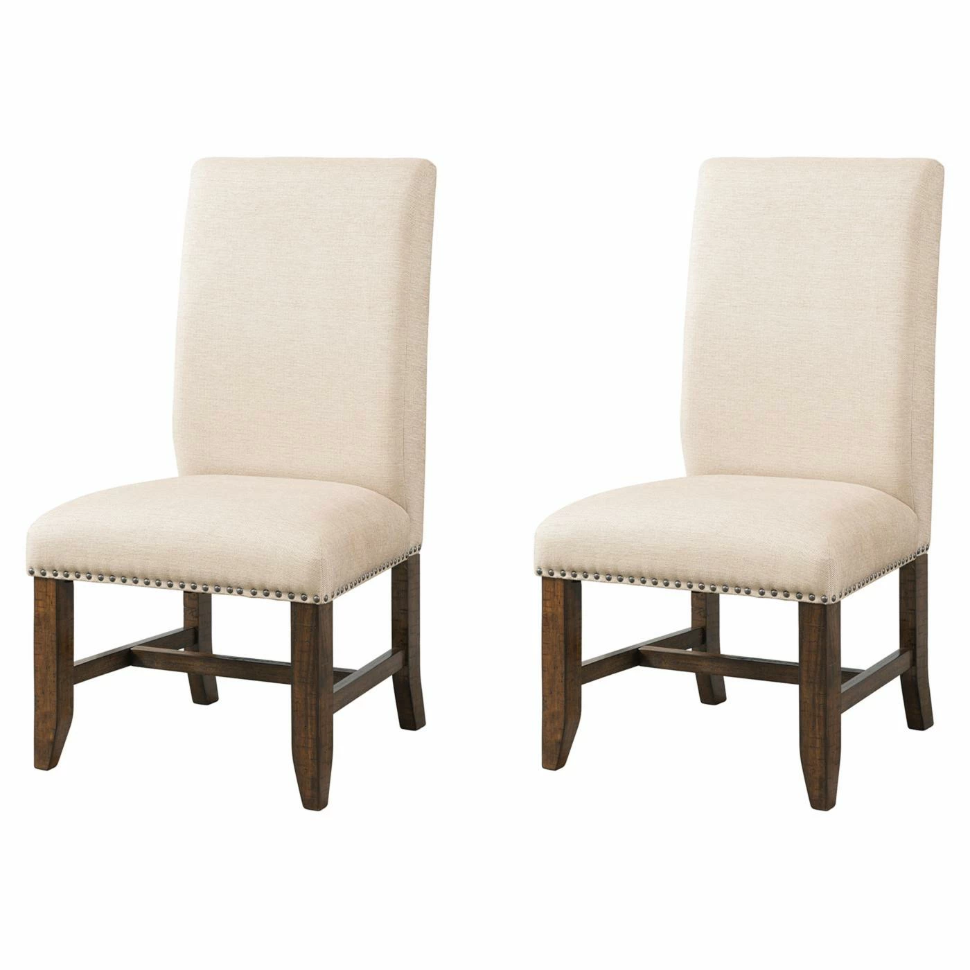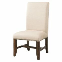 The chic Picket House Francis Upholstered Side Chair – Set of 2 provides casual yet gracious seating around your rustic dining table. The chair boasts a comfortably padded back and seat. It’s graced by natural linen upholstery and accented by dark metal nail head trim along the base. The chair stands on a durable wood framework in a natural chestnut finish. Thick legs taper and back legs are flared. The set includes two side chairs