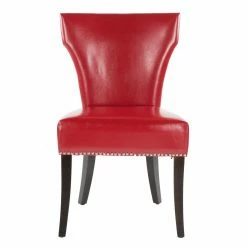 Liven up your space with a pop of color from the Safavieh Maria Dining Side Chairs – Red Leather – Set of 2. Upholstered in bright red bicast leather, this set of two is constructed of solid birch wood that is finished in a rich espresso. Featured among the base of each seat is a decorative nickel nail head detailing.