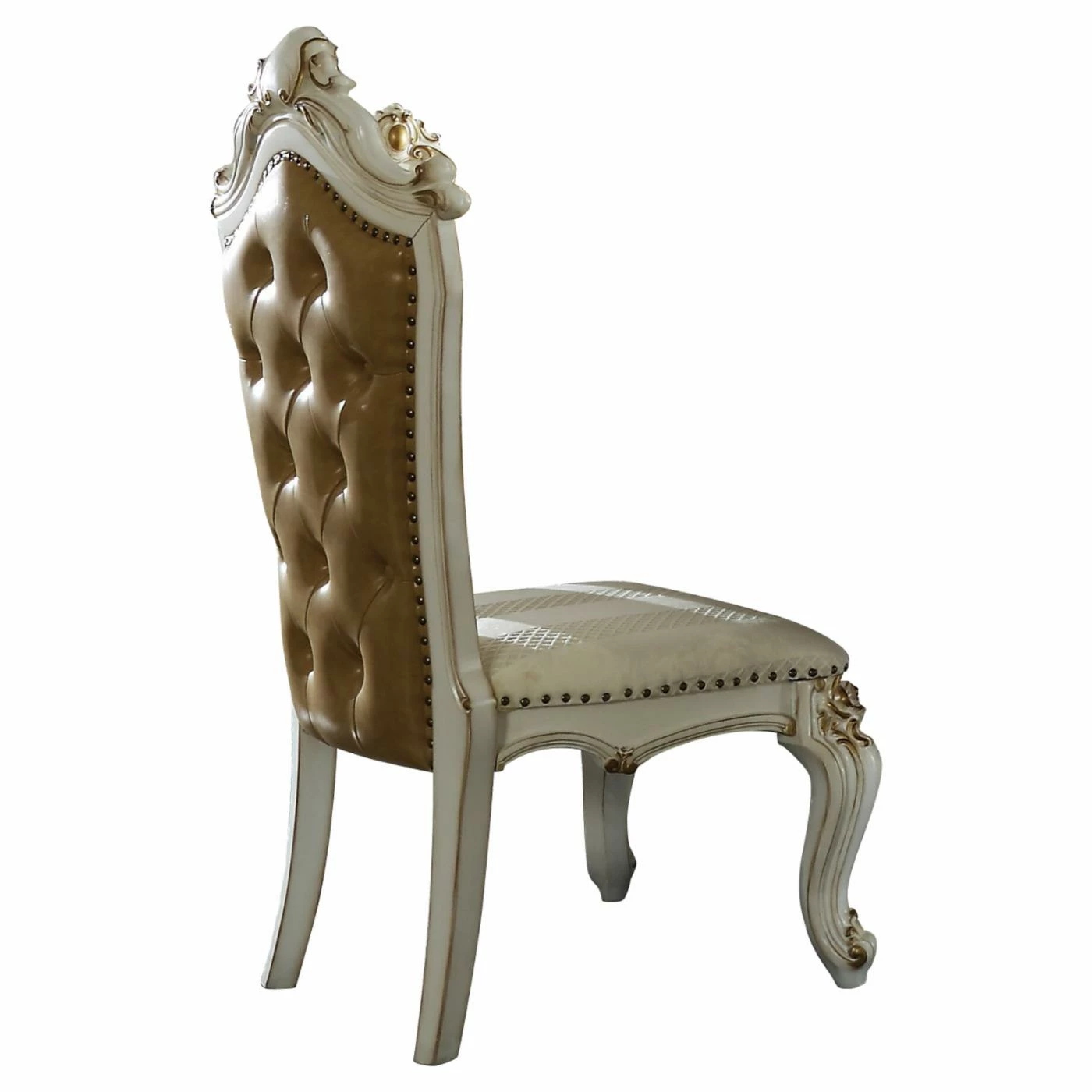Create a stunningly elegant look for your dining room dΓ©cor with the Acme Furniture Picardy Dining Side Chair – Set of 2. This dining chair comes as a set of two and features an armless design accented by a gold floral motif and nailhead trim detailing. Its comfy seat and arched backrest are covered with amply padded ivory fabric upholstery adorned with damask embroidery, and the chair’s backside is upholstered with button-tufted faux leather cushioning in a cognac brown hue. The chair’s solid wooden frame is made with sturdy rubberwood in an ivory finish, and it stands on ornately designed Queen Anne scroll legs.
