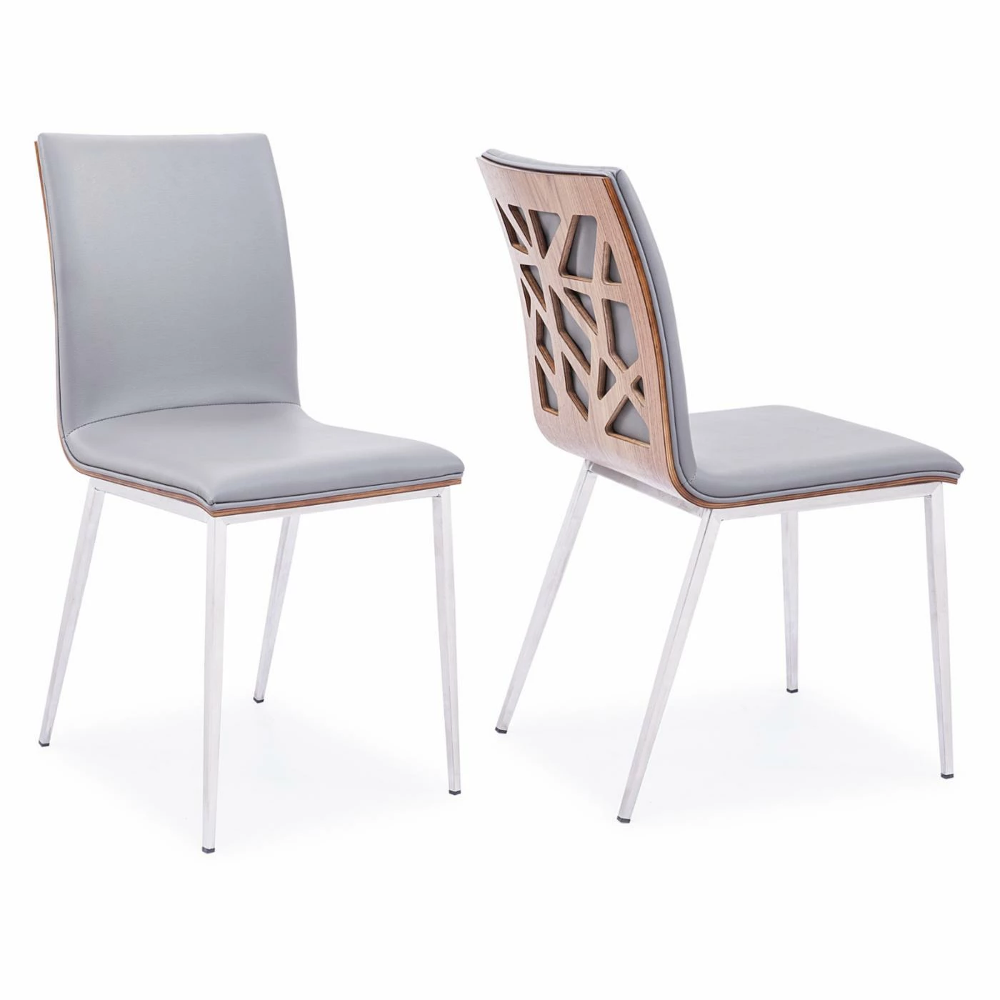 Forge your own pathway toward mid-century modern with the Armen Living Crystal Dining Chair – Set of 2. These chairs capture key features of the style. Bent wood backrests feature artistically arranged geometric cut-outs and walnut veneers. Enjoy comfort and practicality with the gray faux leather seats and backrests. Stainless steel legs are chromed for a touch of luster.