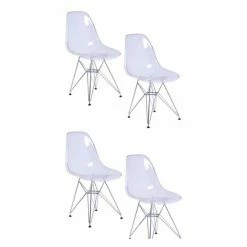 Crystal clear acrylic is molded to form the comfortable, flexible back and scoop seat of the Aron Living Tower Wire Leg Chair. This chair sits on an Eiffel wire leg base in a gleaming silver finish. It’s the ideal seating option for retro and modern homes.