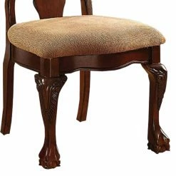 Line the sides of your formal dining table with the Benzara George Town Formal Dining Side Chair – Set of 2. This armless chair features a curved back style with deep engravings for added texture. A neutral beige fabric covers the seat, offering additional comfort.