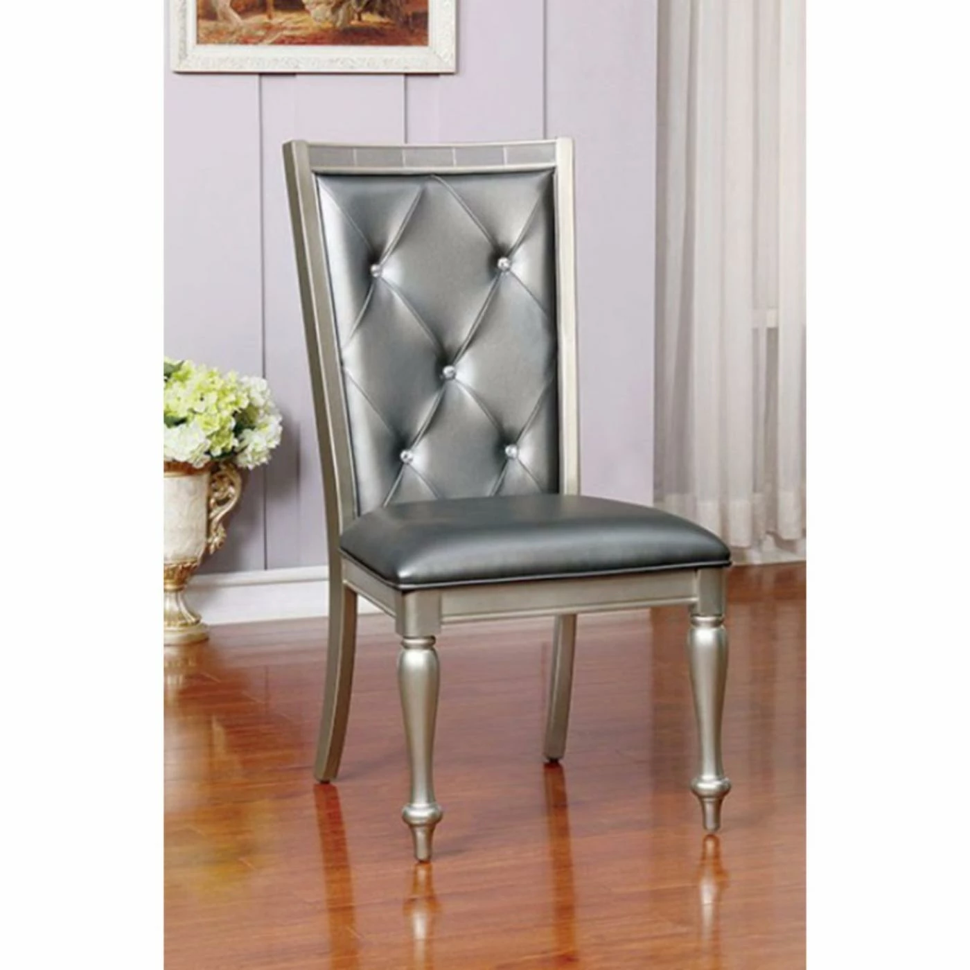 Make your dining room a little more glamorous with the addition of the Benzara Sarina Formal Dining Side Chair – Set of 2. This chair features an eye-catching silver design with pewter faux leather upholstery on the seat and back. The button tufted details add a refined finishing element to this armless dining chair.