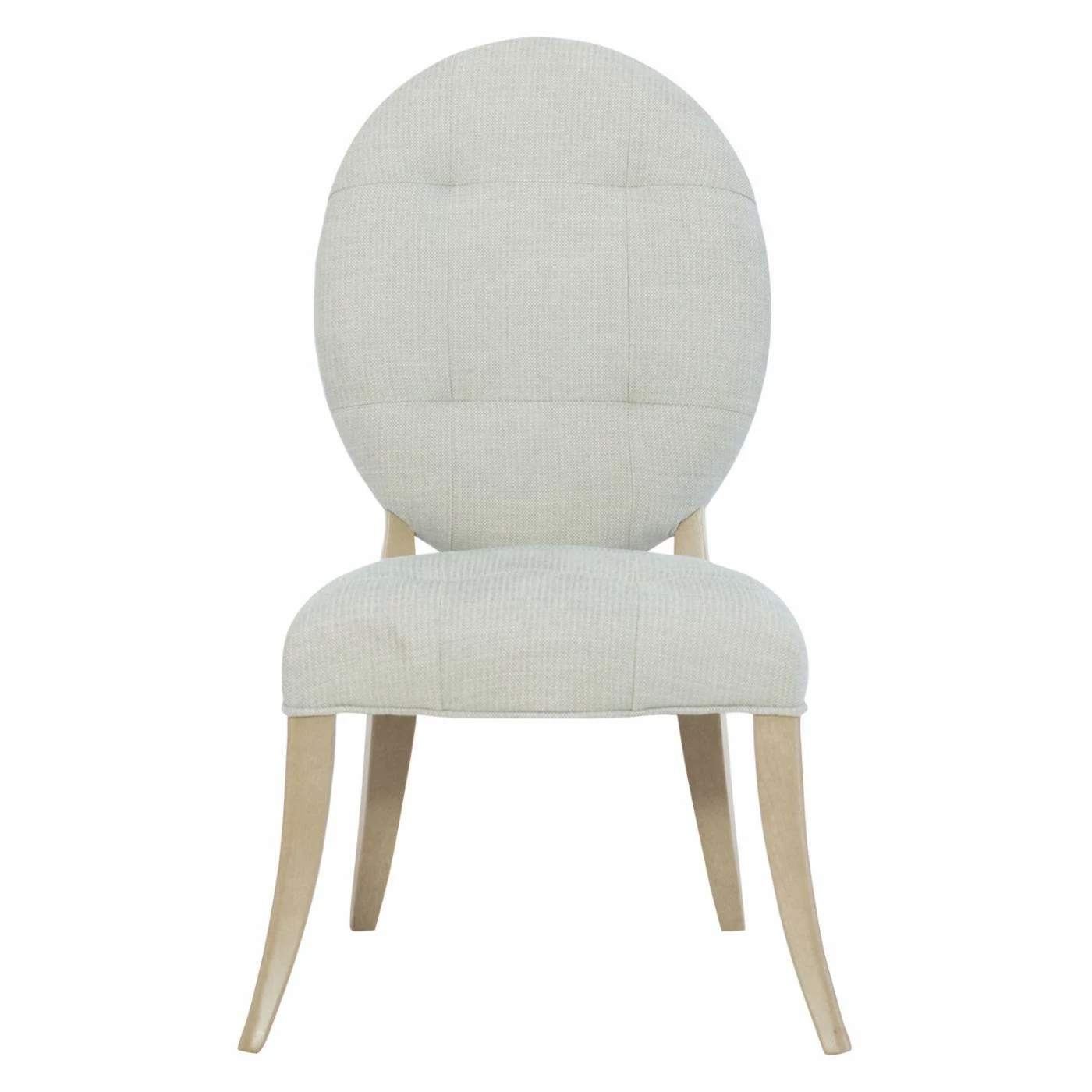The Bernhardt Savoy Place Upholstered Round Back Dining Side Chair deftly blends modern and traditional influences. With its oval backrest, the silhouette is recognizable as a French cameo chair. This is the same shape seen in the iconic clear Ghost chair. Quartered ash veneers in a chanterelle finish show off handsome grain patterns. Thick cushioning provides a level of comfort that will allow guests to linger after a meal. Upholstery in quilted squares is subtly blind-tufted to add granularity to the look.