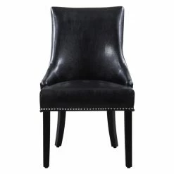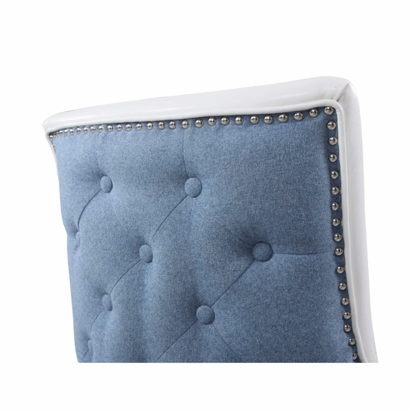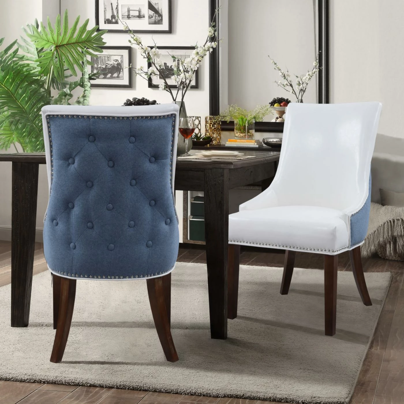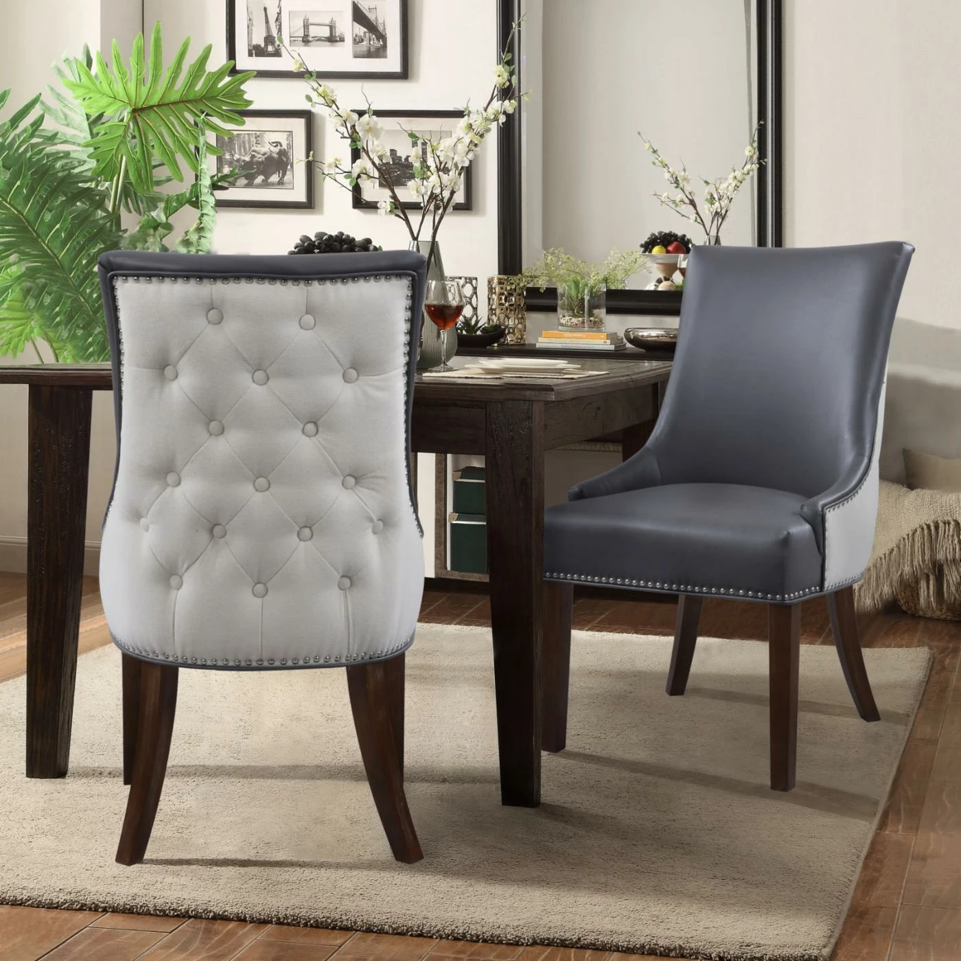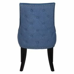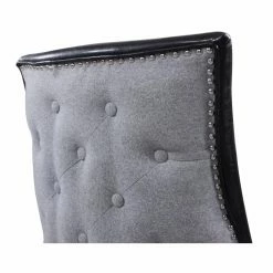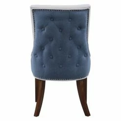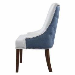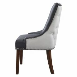 A two-toned beauty, the Chic Home Cooper Tufted Dining Chair with Nailhead Trim – Set of 2 is dressed in luxurious faux leather on the front and crisp linen on the back. Customize the look by choosing from available color combinations. The back of this well-appointed dining chair is detailed by piping trim, nail heads, and diamond button tufting. The set includes two matching dining chairs.