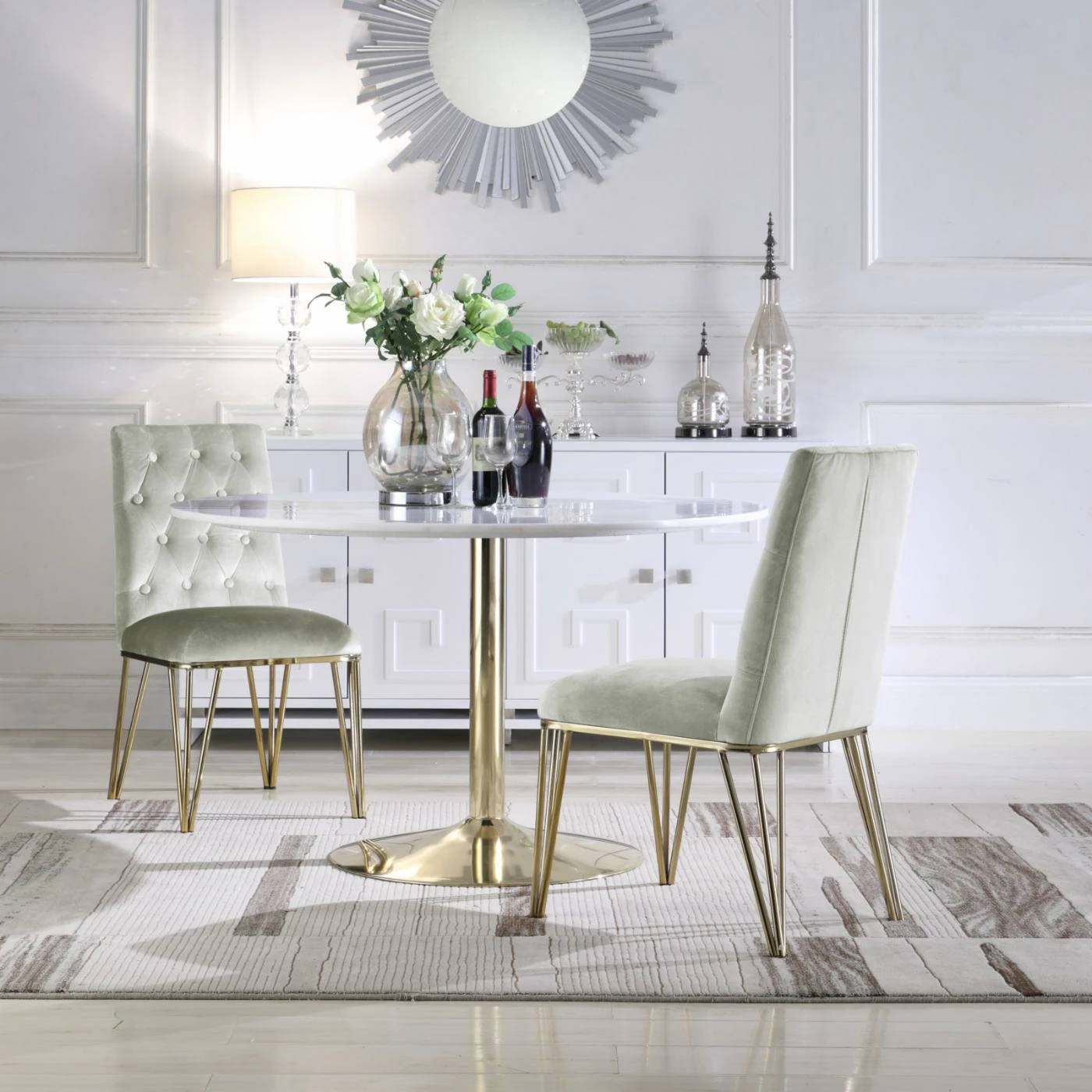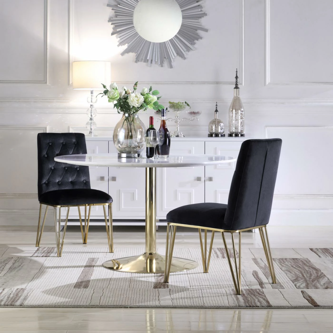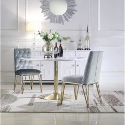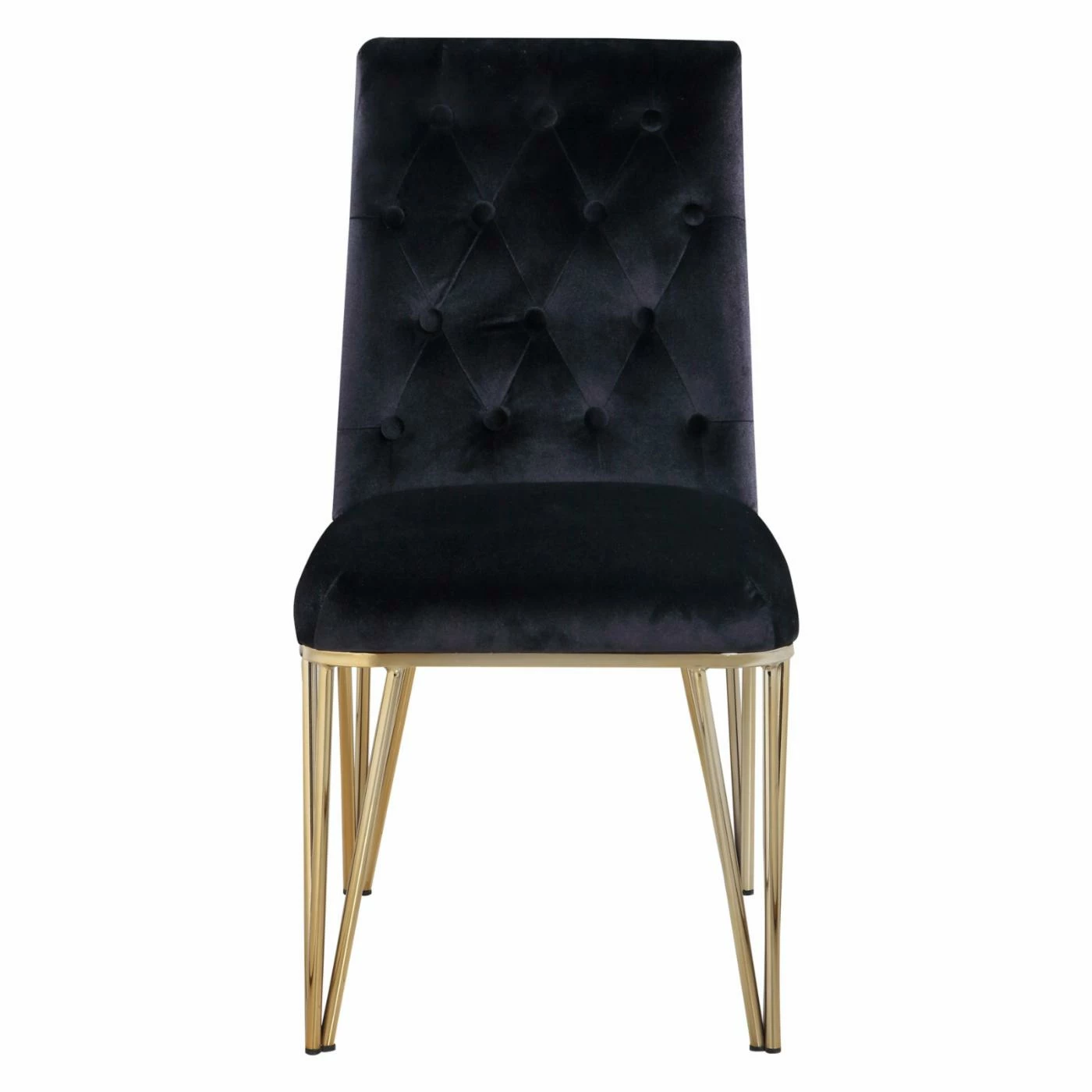 A simple design made sumptuous gives the Chic Home Freya Tufted Velvet Dining Side Chair – Set of 2 the power to revamp your dining room. This set includes two classic dining side chairs dressed in velvet and detailed by button tufting. For a glamorous mid-century modern touch, they sit on metal hairpin legs finished in gold.