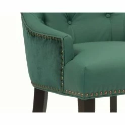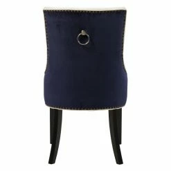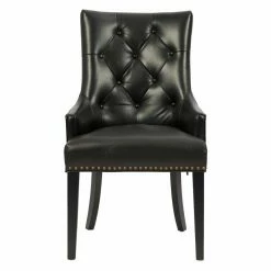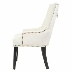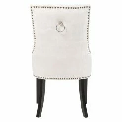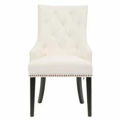 Designer details on the Chic Home Gilbert Tufted Dining Side Chair with Nailhead Trim – Set of 2 include bright nail head trim, diamond button tufting, and an overscaled ring on the back. This well-appointed dining side chair is upholstered in faux leather and customized by your choice of available color story. Tapering legs in espresso offer stylish stability. The set includes two matching side chairs.