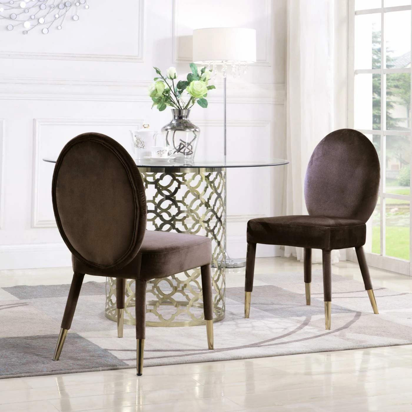 Posh mid-century modern elegance comes over to dine with the Chic Home Jerett Velvet Dining Side Chair – Set of 2. Oval-shaped backrests, roomy seats, and tapered legs are all upholstered in sumptuous velvet. Gold-finished metal ferrules cap the look off nicely. Choose from available fabric colors to find the dining chairs that work best for your home.