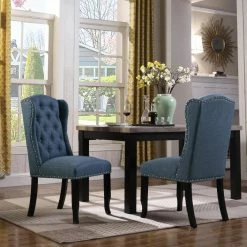 A modified wingback design makes the Chic Home Viola Tufted Dining Side Chair with Nailhead Trim – Set of 2 an elegant way to bring tradition back into your dining room. The stately backrest and generous seat of this dining chair are comfortably cushioned and upholstered in your choice of available colorway. Details include button tufting on the backrest and nail head trim. The set includes two matching dining side chairs.