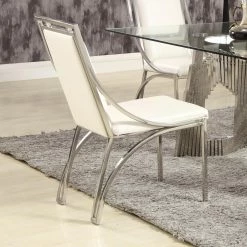The contemporary Chintaly Josie Open Frame Dining Side Chair – Set of 2 features a sleek open steel framework that extends to its legs. The steel is polished to complement the white faux leather upholstery. This set includes two dining side chairs.