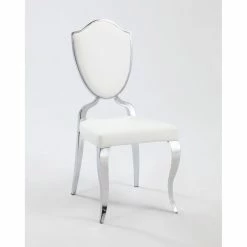 Curvy cabriolet legs and shield-shaped backs hearken back to yesteryear, but the look is perfectly updated thanks to the high-shine chrome finish and white upholstery, which is made of durable polyurethane. And the foam padding is more than just cozy – itβs fire retardant for extra safety.