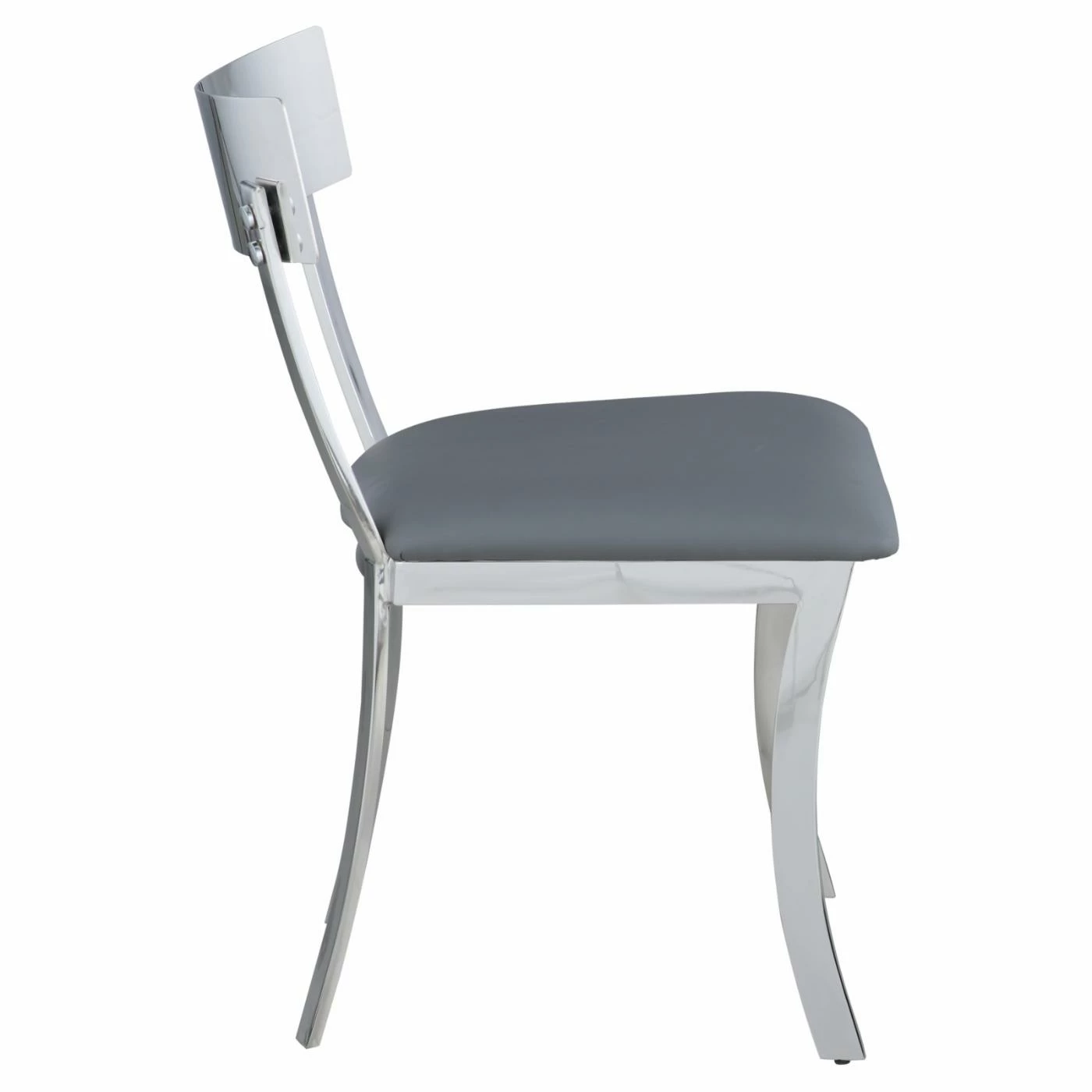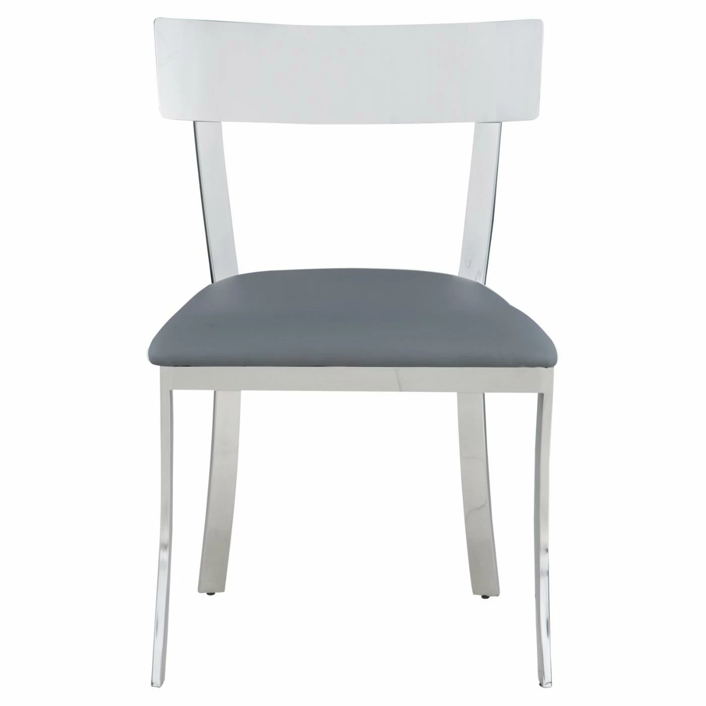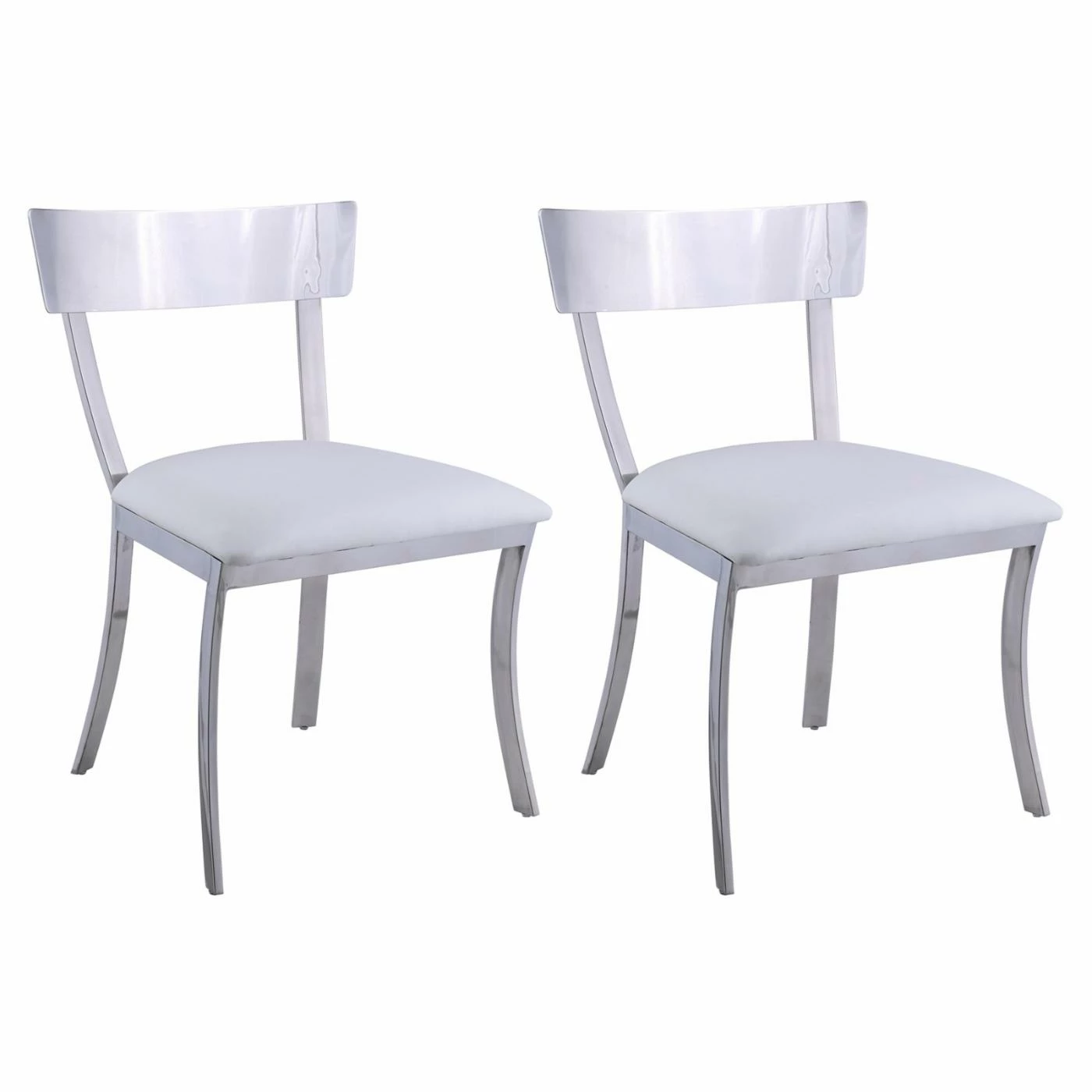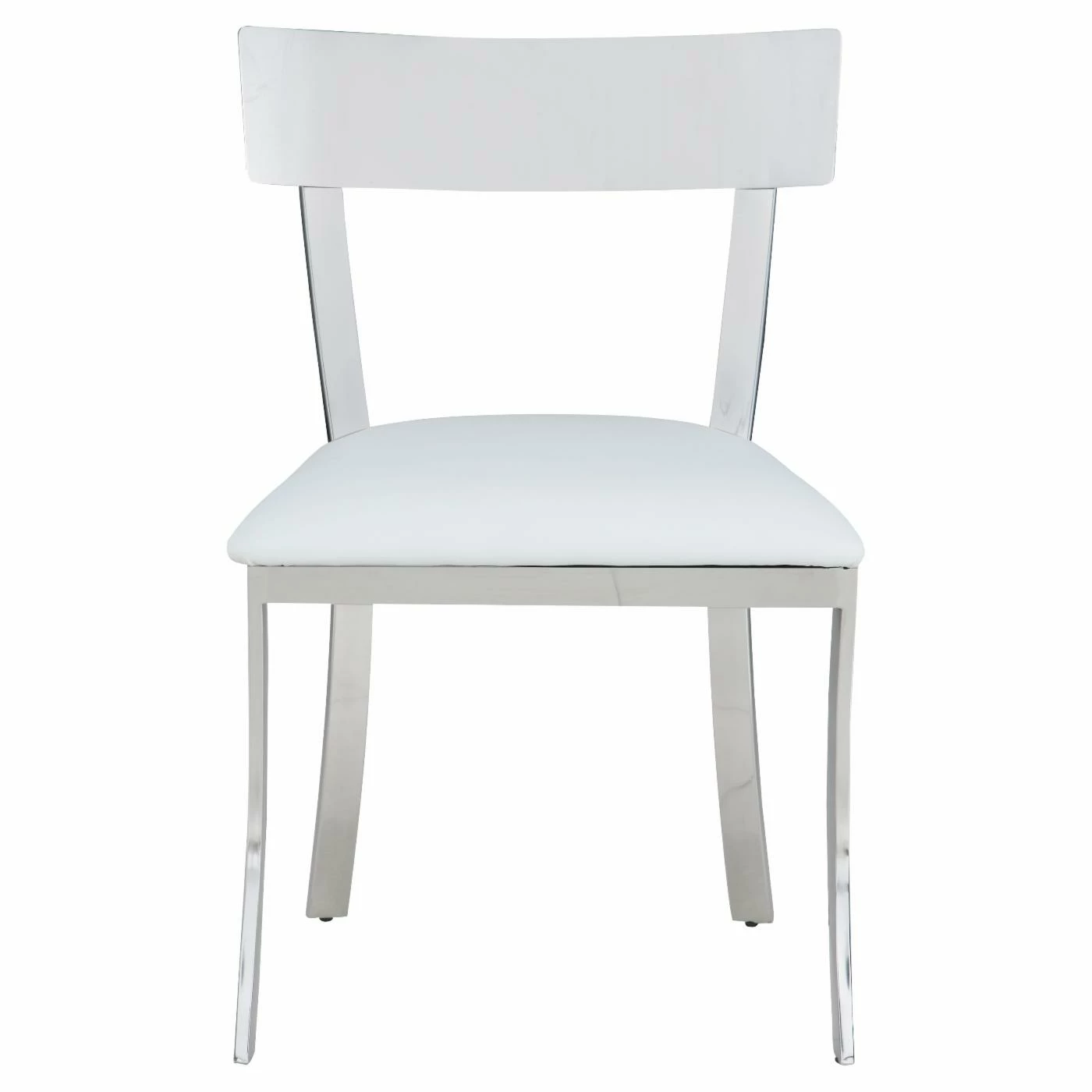 A comfortably contoured, open backrest on the Chintaly Maiden Curved Back Dining Side Chair – Set of 2 is made of polished steel for a contemporary shimmer. This side chair sits on slim saber legs. To ensure guests are comfortable, the generous seat is upholstered in your choice of available faux leather color. This set includes two chairs.