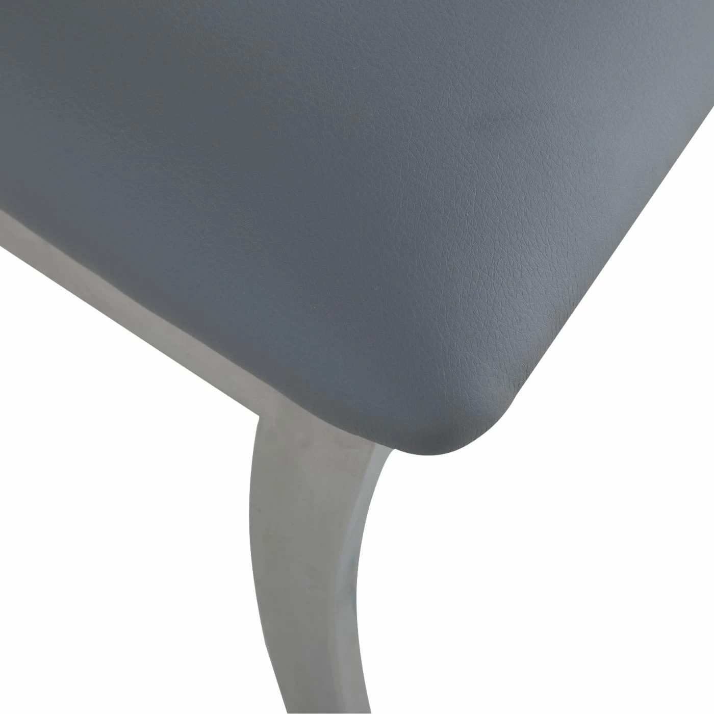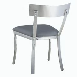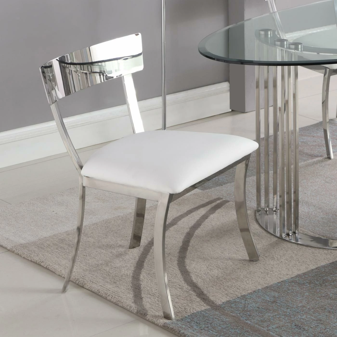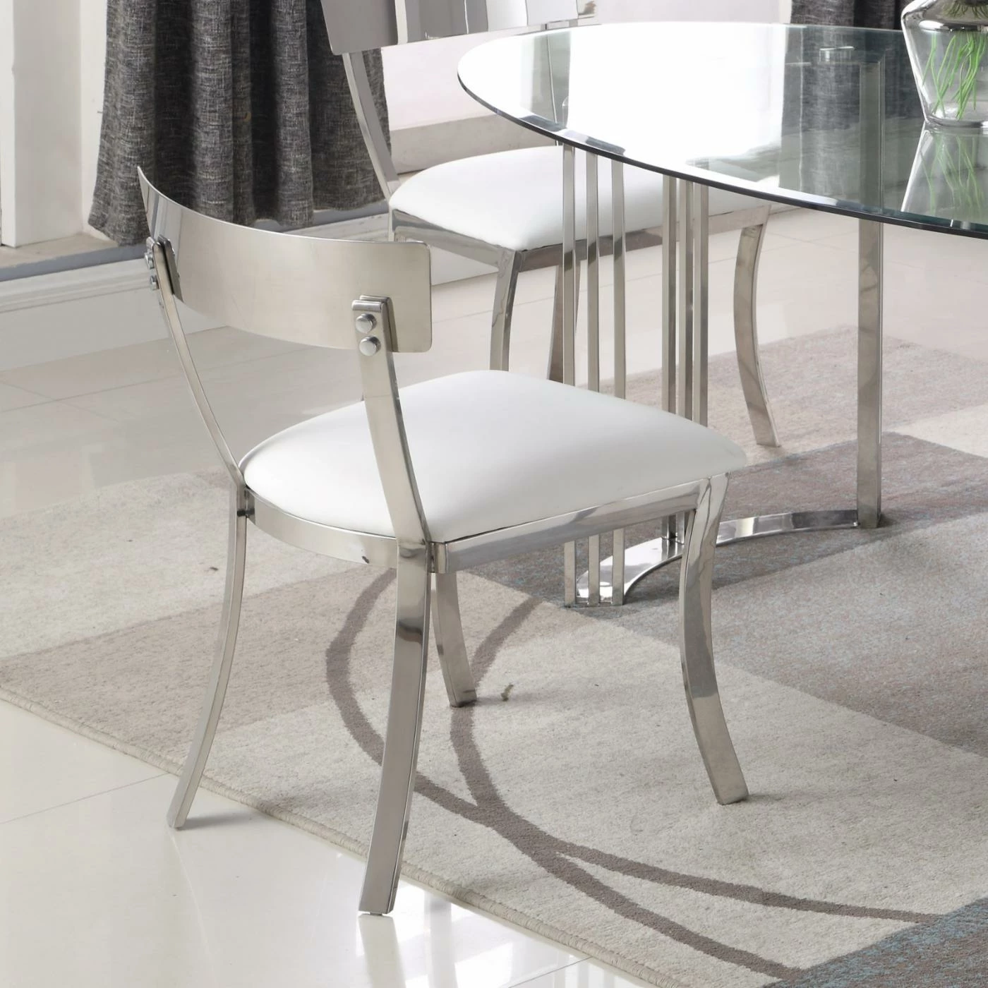 A comfortably contoured, open backrest on the Chintaly Maiden Curved Back Dining Side Chair – Set of 2 is made of polished steel for a contemporary shimmer. This side chair sits on slim saber legs. To ensure guests are comfortable, the generous seat is upholstered in your choice of available faux leather color. This set includes two chairs.