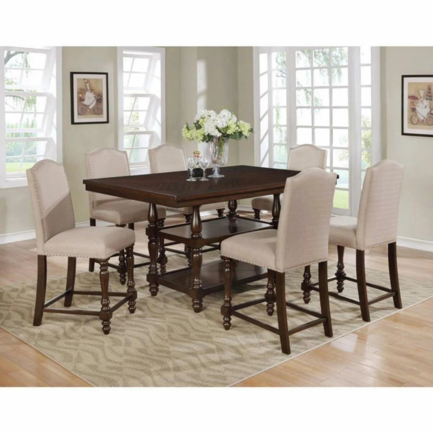 Turned legs and nailhead trim define the Crown Mark Langley Fabric Solid Back Upholstered Counter Height Dining Side Chair – Set of 2, making it a study in classic elegance. These chairs feature durable wood frames that are topped in a deep espresso finish. The rich hue of the wood is paired with crisp taupe fabric upholstery for a winning duo.