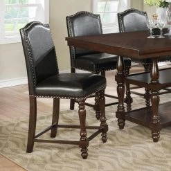 Replete with distinctive, attention-getting appeal, the Crown Mark Langley Vinyl Solid Back Upholstered Counter Height Dining Side Chair – Set of 2 makes a handsome addition to your dining room. These chairs feature wood frames that sport a deep espresso finish that’s attractively complemented by the black faux leather seat upholstery. Turned legs and nailhead trim lend decidedly elegant final touches.