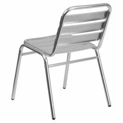 Simply chic and versatile, the Flash Furniture Aluminum Commercial Indoor-Outdoor Slat Back Armless Restaurant Stack Chair makes a smart and stylish addition to your outdoor patio or modern indoor eating space. This lightweight aluminum chair is finished in silver and boasts an efficient design for all-weather use and stacks for easy storage. It features a slatted seat and back, and the supportive cross braces add extra stability. Capped plastic feet protect floors from damaging scratches.