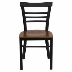 Ultra durable, the Flash Furniture Hercules 17.25 in. Metal and Wood Rounded Ladder Back Restaurant Chair can stand the test of time in even the busiest of restaurants. The ladder-back chair is manufactured out of 18-gauge steel with welded joint assembly for maximum strength and wear resistance. To make the chair simple to clean, the seat is left upholstered. Thick plywood gives it the appealing look of natural wood and comes in your choice of available finishes. On the bottoms of the feet are plastic glides that shield hard floors from damage.