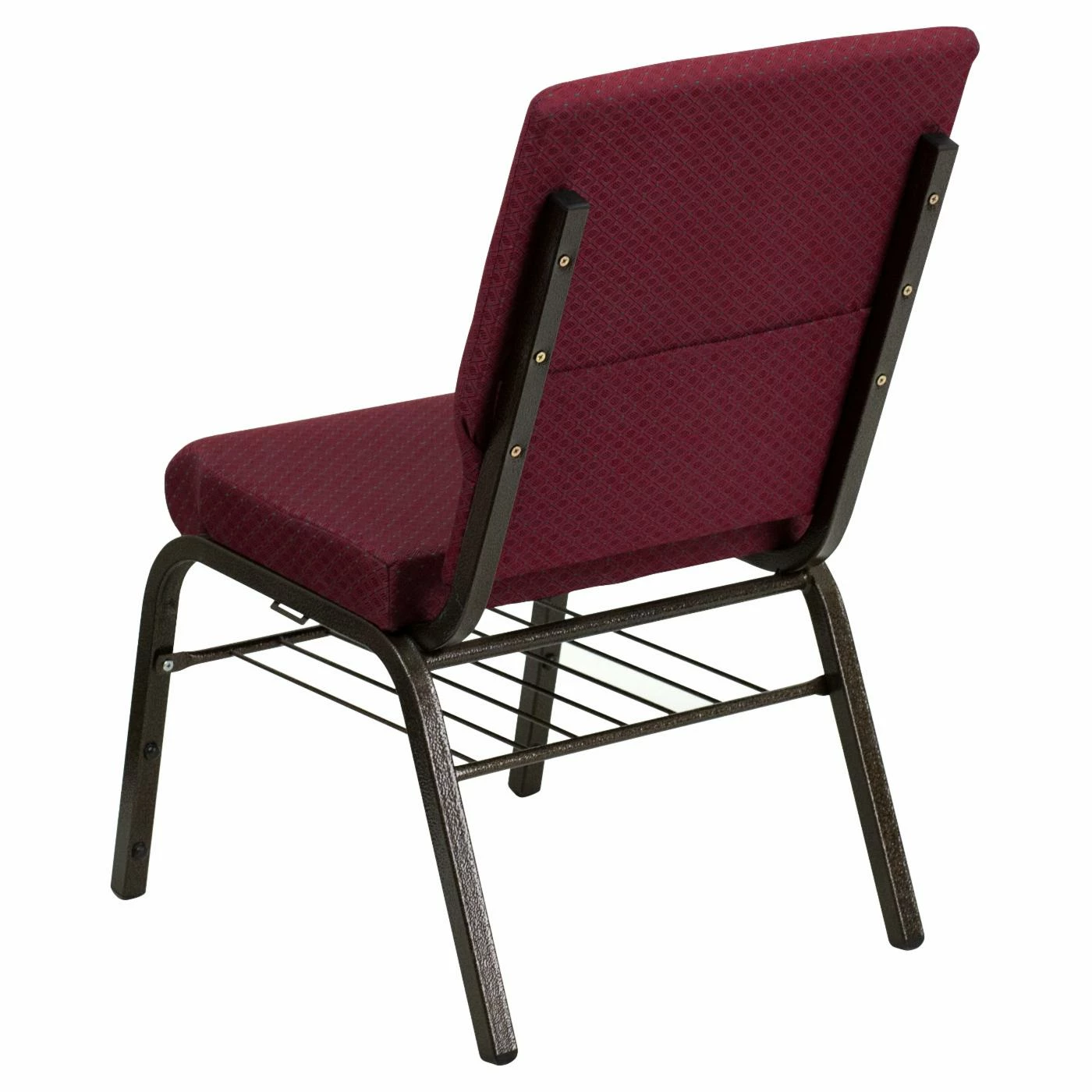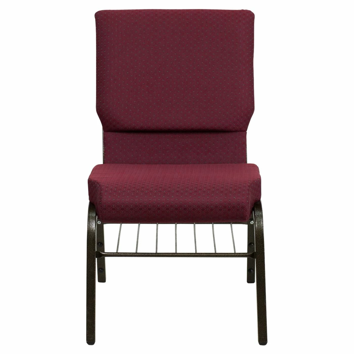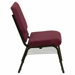 Perfect for primary or extra seating in the sanctuary and beyond, the Flash Furniture HERCULES 17.5 in. Burgundy Patterned Fabric Church Chair is a comfortable seating solution covered with thick foam padding and durable fabric upholstery. The seat has a waterfall front edge that lessens pressure on the legs to promote healthy circulation. Fabricated out of 16-gauge steel, the frame is sturdy enough to hold 800 pounds of weight. For storage, the chairs feature pockets on their backs and wire book racks beneath the seats. Ganging brackets on the legs can be used to attach several of the chairs together to make neat rows for permanent seating. Plastic rocker glides protect your floors no matter how you choose to use the chairs.