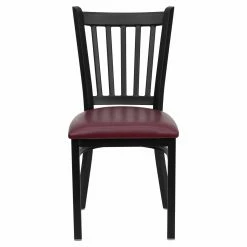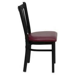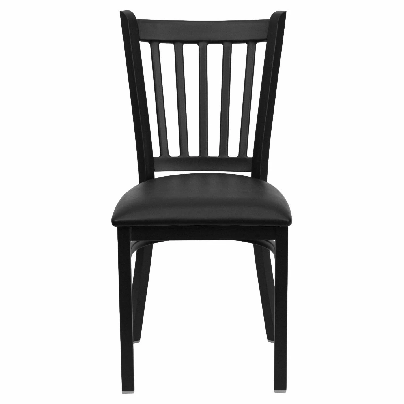 A wide, tall slat back gives the Flash Furniture Hercules 18.5 in. Metal and Vinyl Vertical Slat Back Restaurant Chair plenty of back support for comfortable dining. The thick padding beneath the easy-to-clean vinyl upholstery further enhances the luxurious feel of this timeless commercial-grade dining chair. Able to stand the test of time even with frequent daily use, the chair frame is constructed out of 18-gauge steel and welded at every joint. Plastic floor glides help to preserve hardwood and other hard flooring surfaces.