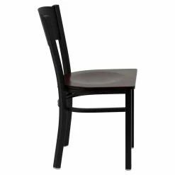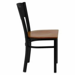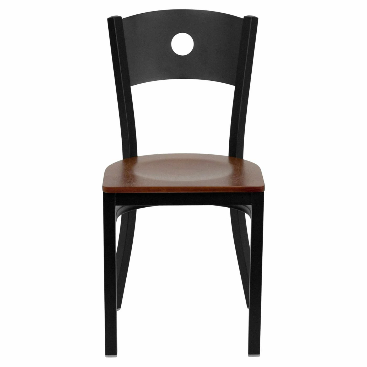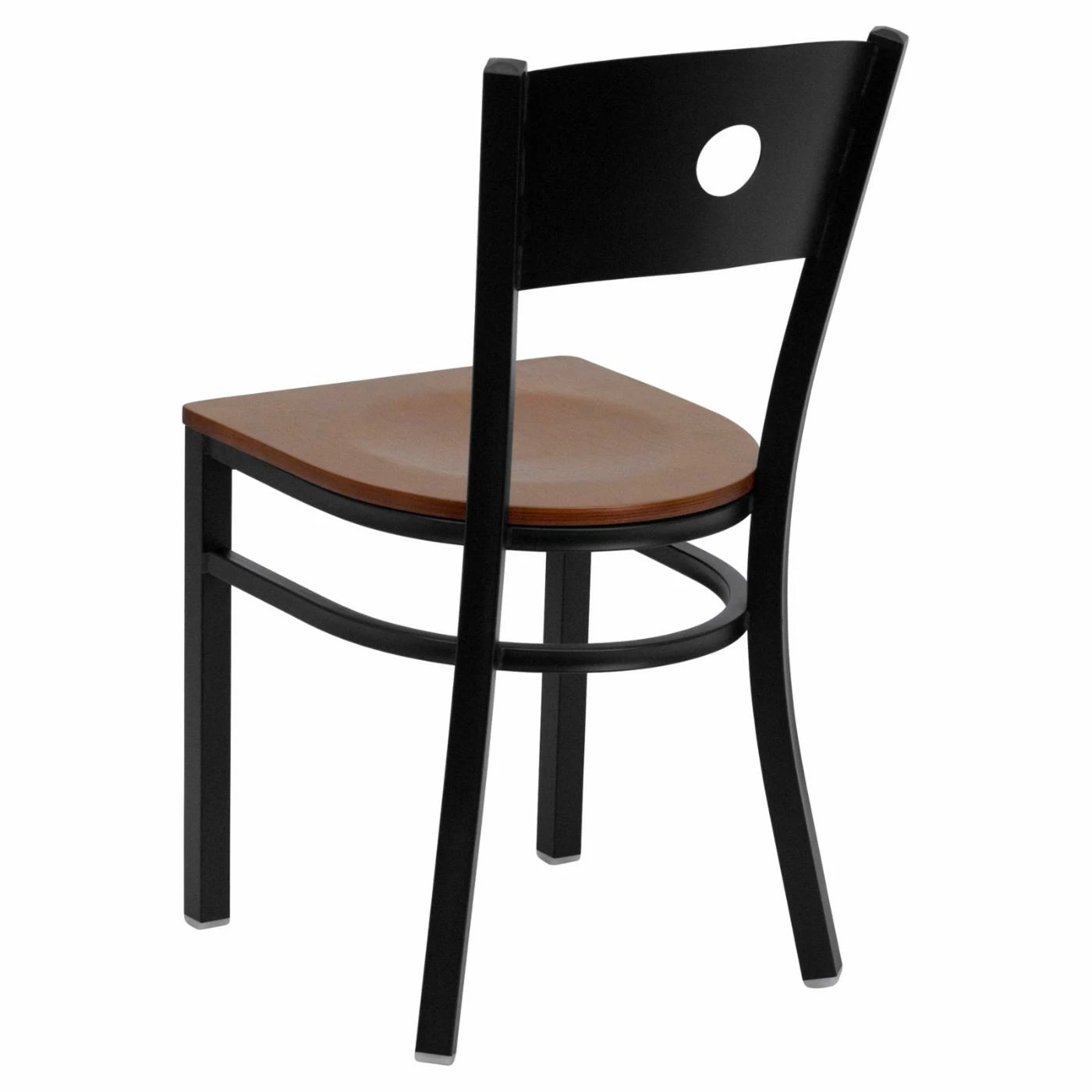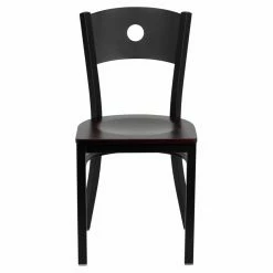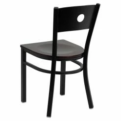 The circle cut into the back of the Flash Furniture Hercules 18 in. Metal and Wood Circle Cutout Restaurant Chair adds a modern touch to the design and doubles as a handle for easy lifting and carrying. Perfect for commercial use, the chair is built to take a beating out of 18-gauge steel that is welded at every joint. The plywood seat contrasts with the black powder-coated finish on the frame and has a contoured design for optimal support. Thanks to the plastic floor glides, the chair can be used on hard flooring without worry about scratches.