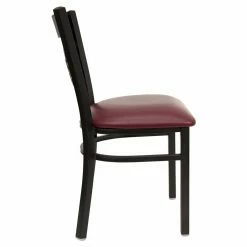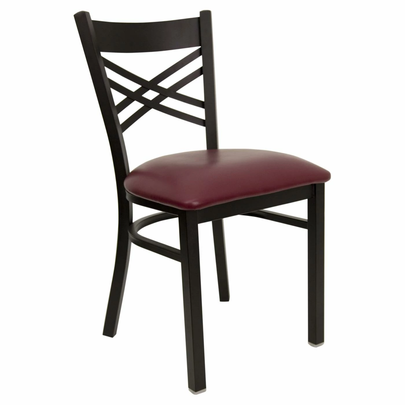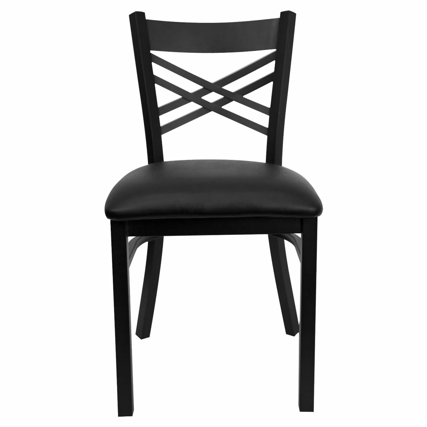 A crisscross back design gives the Flash Furniture Hercules 19.5 in. Black Metal and Vinyl X Back Restaurant Chair plenty of timeless appeal, while its welded joint 18-gauge steel frame offers reliable durability to stand the test of time. The heavy-duty chair features thick foam padding on the seat for comfort. Vinyl upholstery adds a touch of luxury while ensuring that the chair is easy to clean and maintain. Glides on the bottoms of the feet keep your floors free of scratches.
