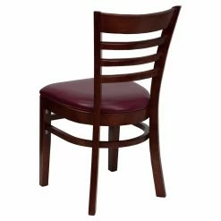 Give your dining room an elegant, traditional look with the ladder-back design of the Flash Furniture Hercules 19.5 in. Mahogany and Vinyl Ladder Back Restaurant Chair. Fabricated out of solid European beach hardwood and assembled with mortise-tenon-style construction, the chair is sturdy and able to hold up to daily wear. Metal wood screw reinforcements and a curved support bar further enhance the durability. The wood is finished in mahogany to bring an appealing wood grain and rich color to your dΓ©cor. Padded with foam, the seat is comfortable and wrapped in vinyl upholstery for the perfect balance of luxury and cleaning convenience.