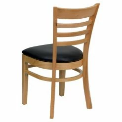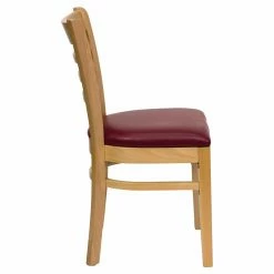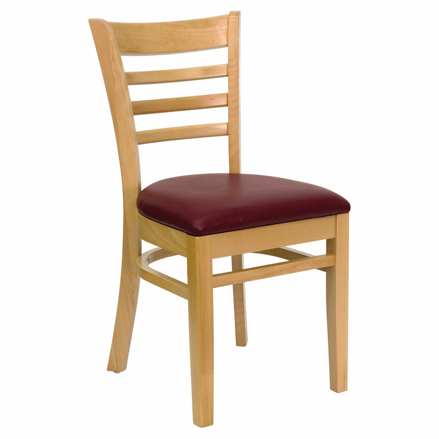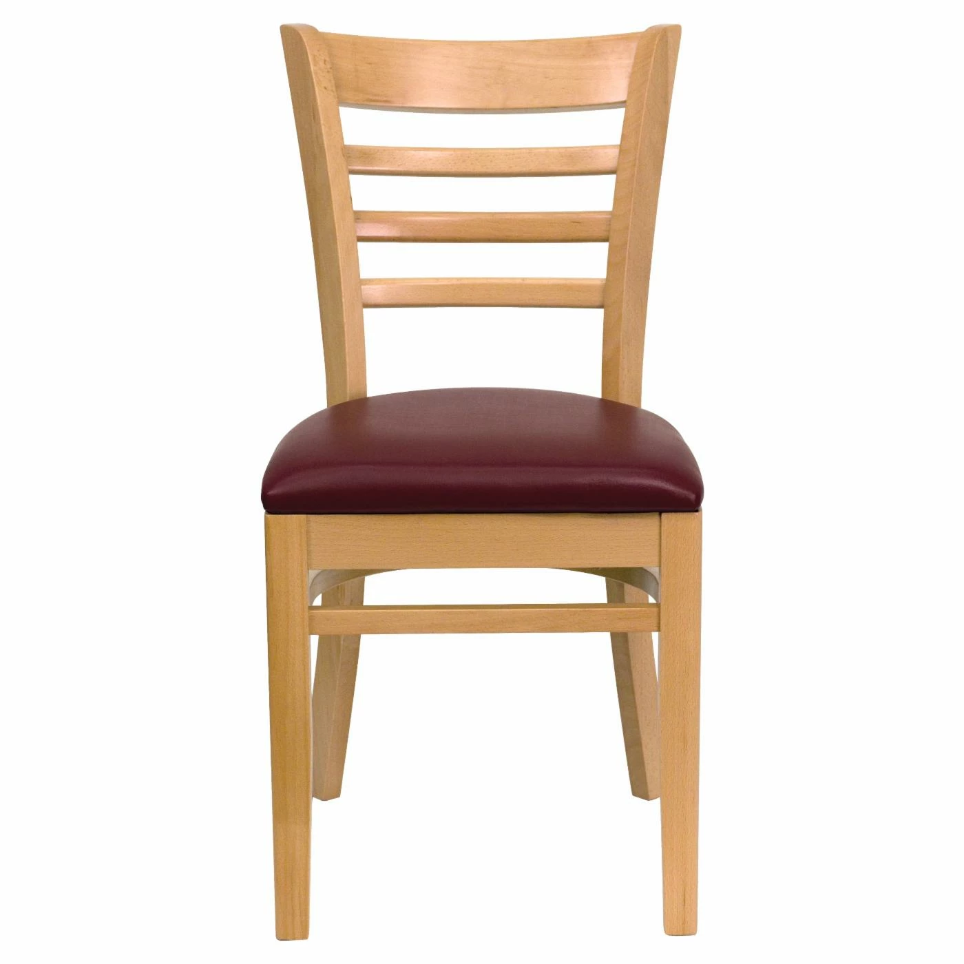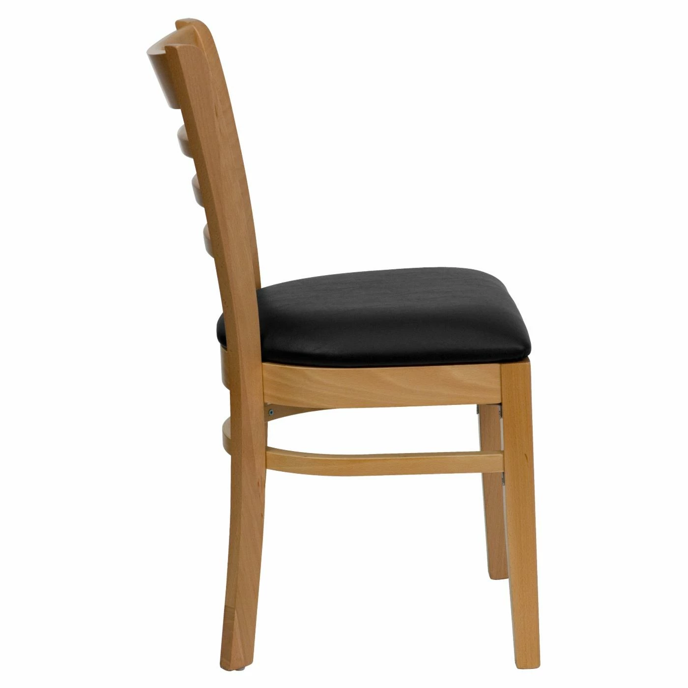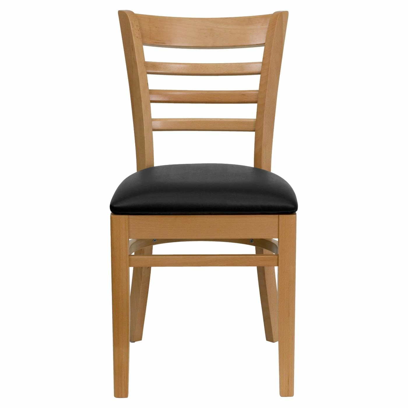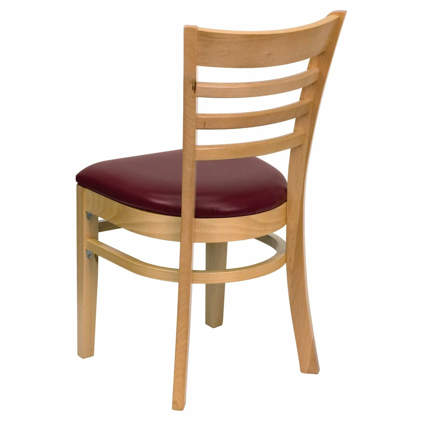 Showcasing a natural wood finish on high quality solid European beech hardwood, the Flash Furniture Hercules 19.5 in. Natural Wood and Vinyl Ladder Back Restaurant Chair brings classic elegance to commercial dining areas. Mortise-and-tenon construction and metal wood screen reinforcements ensure that this sturdy chair can stand the test of time. The ladder back provides plenty of back support for comfort, and the seat is padded with 2.5 inches of foam for a plush feel. Upholstered with vinyl, the seat looks and feels like real leather but is simple to maintain. Plastic glides are secured to the legs to protect your flooring.