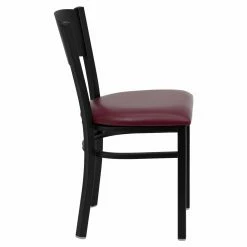 A circular cutout makes the Flash Furniture Hercules 20 in. Metal and Vinyl Circle Cutout Restaurant Chair chic and easy to lift. This fashionable, functional dining chair is ideal for commercial use due to the strength of its welded 18-gauge steel frame and backrest. For comfort, the seat is plush and padded with 2.5 inches of foam and then upholstered in easy-to-maintain faux leather vinyl. Protective glides on the feet reduce the risk of your floors becoming damaged by the chair.