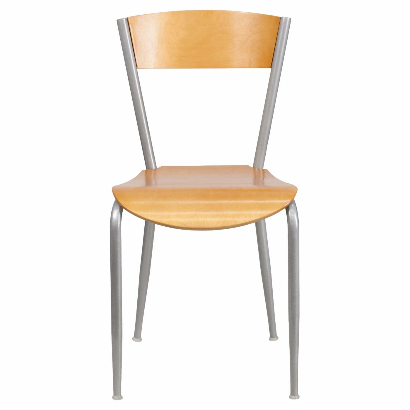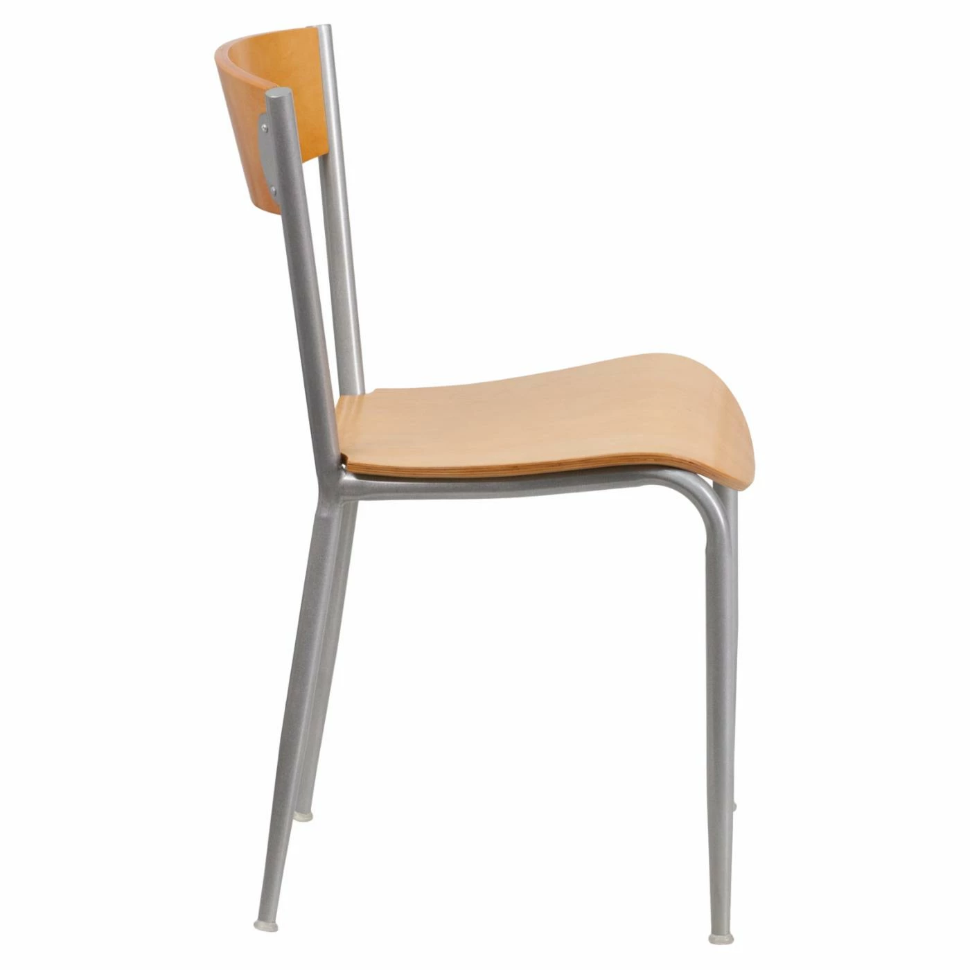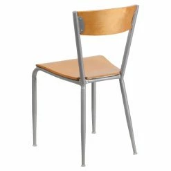 Complete your dining room dΓ©cor with the rustic look of natural wood, compliments of the Flash Furniture Invincible 19.5 in. Metal Restaurant Chair with Wood Back and Seat. Both the solid wood back and plywood seat show off an appealing wood grain effect that is offset by the silver powder-coated finish on the 18-gauge steel frame. Durably crafted, the chair features welded joints that make it strong enough for commercial use. The tapered legs are capped with round feet for stability and equipped with plastic glides to protect your floors.