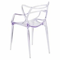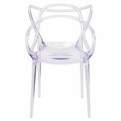 The Flash Furniture Transparent Nesting Series Stacking Side Chairβs sleek modern styling features a contoured back for comfort and a curved waterfall seat to let your legs relax without strain. Integrated arms add a supportive touch to this chairβs durable, reliable design. Crafted from sturdy polycarbonate with a clear, crystal finish, this transparent chair brings lightness to your dΓ©cor, and it stacks easily for convenient storage.