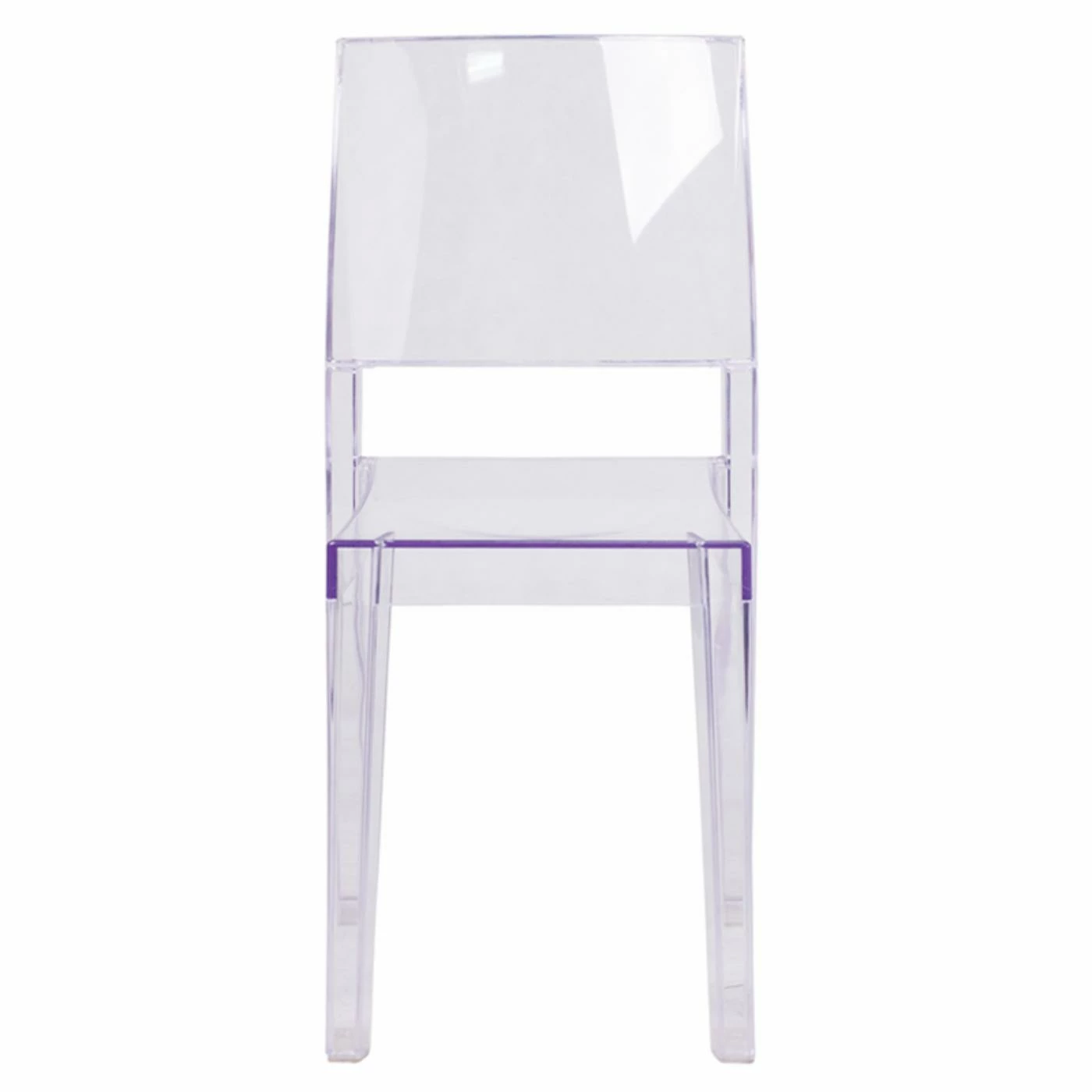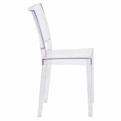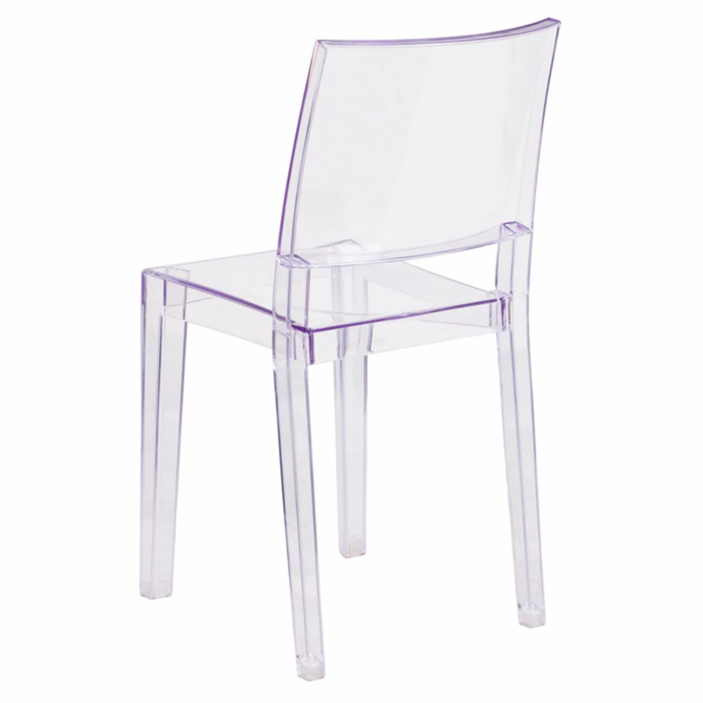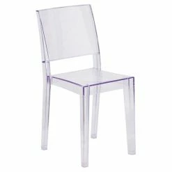 Crafted from clear polycarbonate with a crystal finish to create a refined look that adds visual lightness to crowded spaces, the Flash Furniture Transparent Phantom Series Stacking Side Chair provides additional seating for events and entertaining. The durable construction allows you to use it indoors or outdoors for versatile appeal. Plus, it stacks for convenient moving and storage.