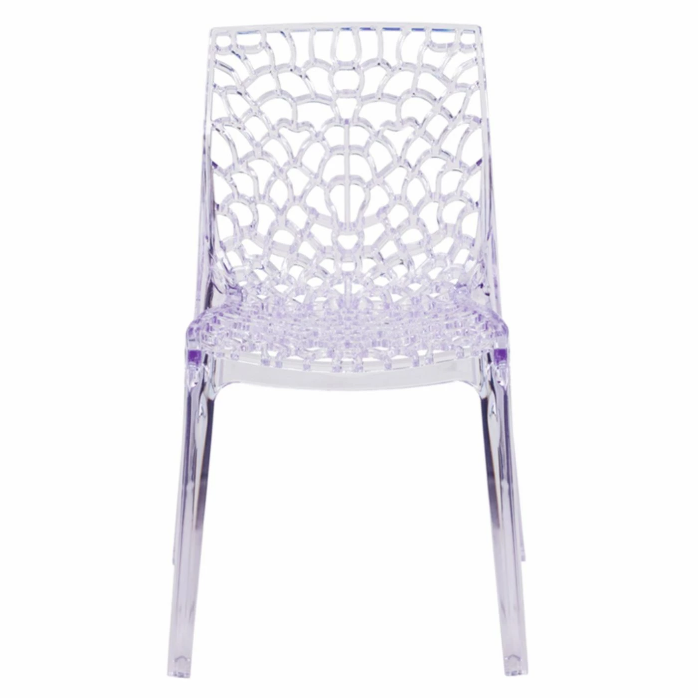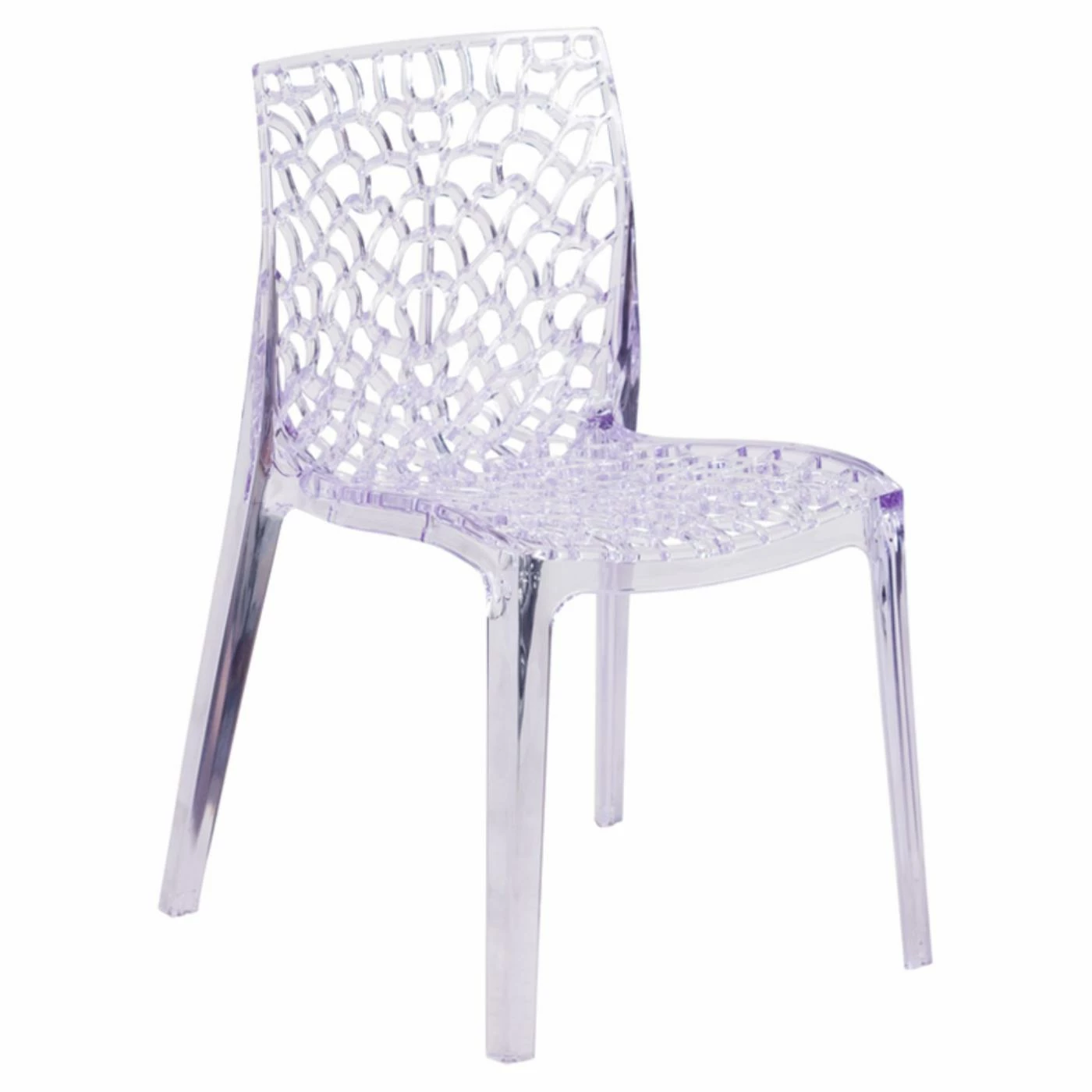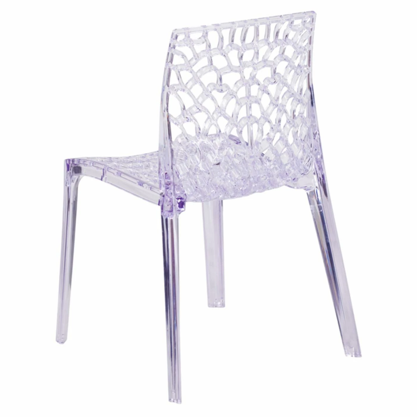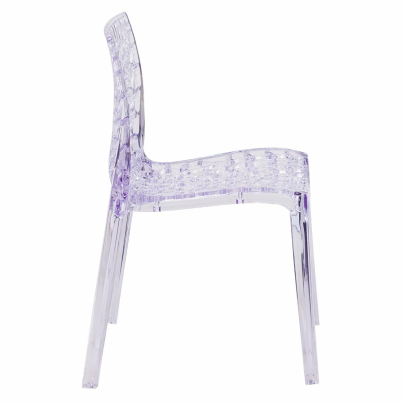 Allover openwork details add visual and textural appeal to the Flash Furniture Transparent Vision Series Stacking Side Chair, creating an artistic take on classic side seating. Durable polycarbonate creates a lightweight yet reliable design that can be stacked for convenient moving and storage. The transparent, crystal-finish look adds lightness to your dΓ©cor, ideal for events and crowded spaces.