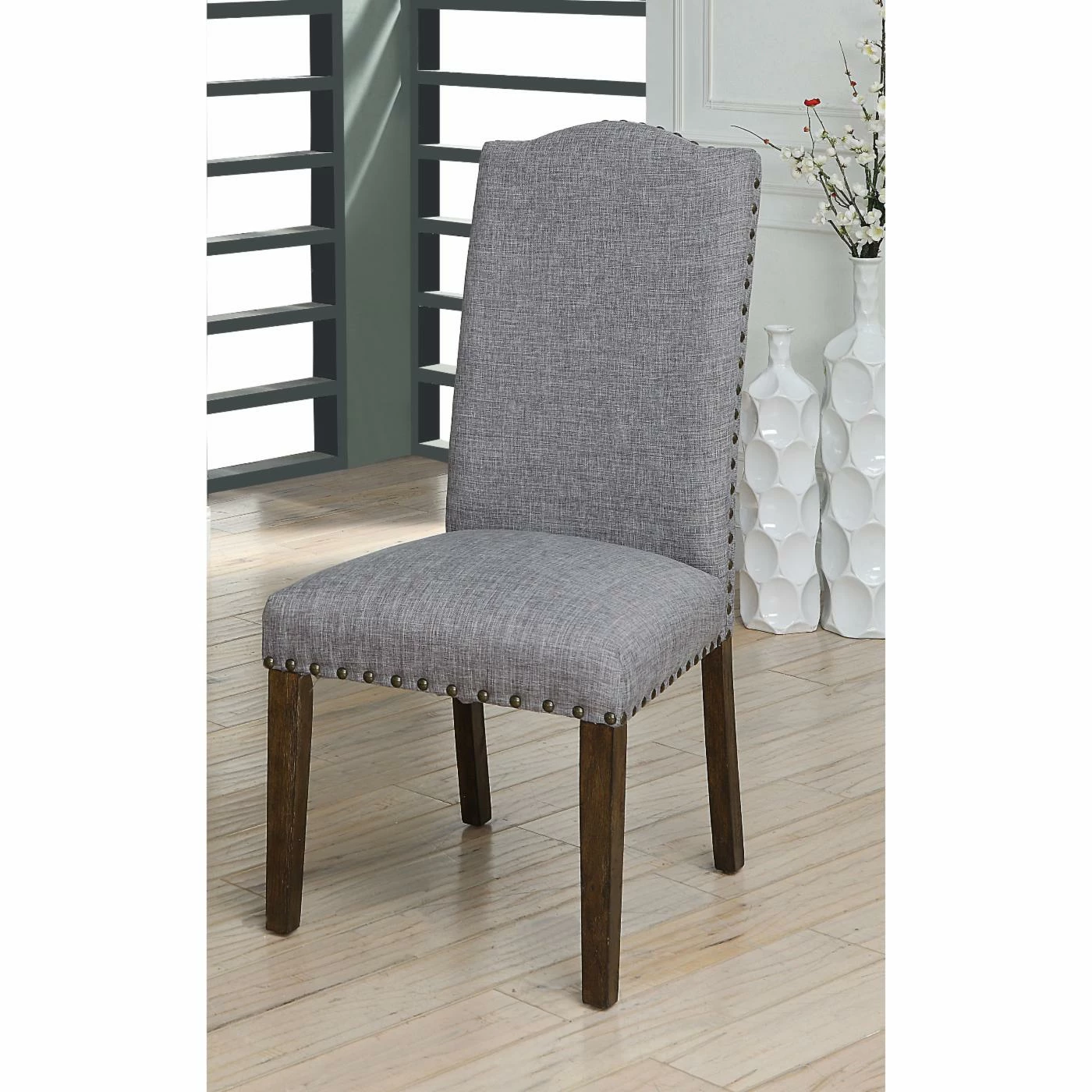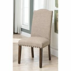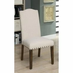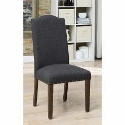 Add a tailored look to your dining area with the Furniture of America Amherst Nailhead Trim Faux Linen Dining Side Chair – Set of 2. Soft faux linen upholstery surrounds the cushioned seat and high backrest, and is finished with nailhead trim. Choose from available color options to make it yours. Assembly required.