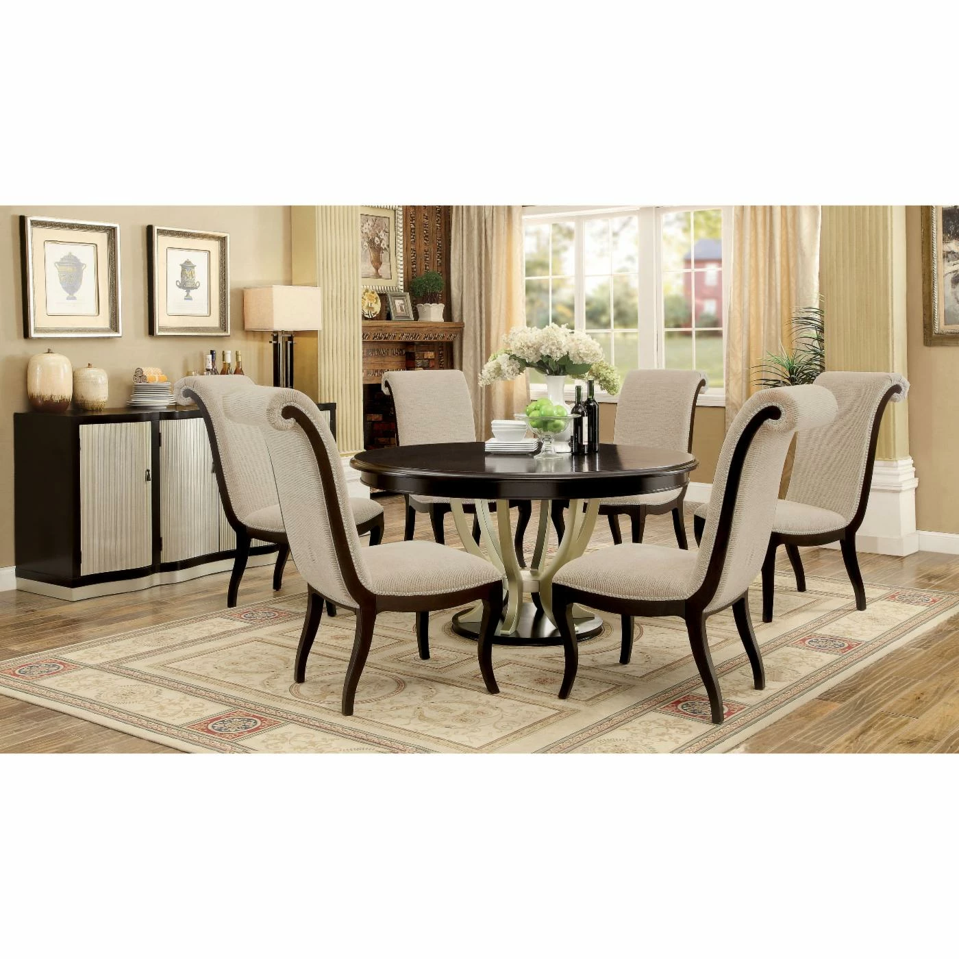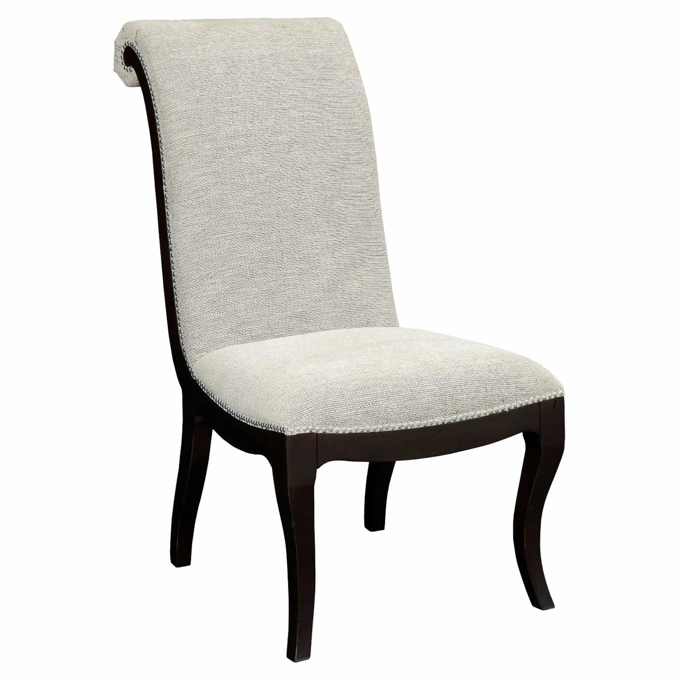 For a chic seating option in your formal dining room, the Furniture of America Cecille Scrollback Dining Side Chair – Set of 2 is dressed to impress in linen-like upholstery. An elaborately scrolled back and bright nail head trim add elegant detail. This dining chair sits on saber legs in a deep espresso finish for stylish support. This set includes two dining side chairs.