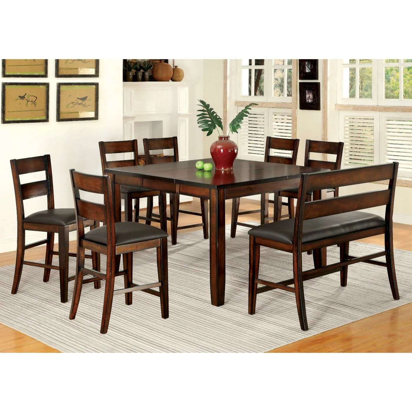 What better way to dine than sitting close to your favorite person? The Furniture of America Gibson Counter Height Dining Bench offers a wide seat for two that’s sure to couple well with your classical dining set or country-style breakfast nook. This bench seat comes with subtly curved legs and wide ladder back with thick slats for comfort. Sturdy hardwood solids are used to craft this piece, overlaid with fine veneers and coated with a beautiful dark cherry finish. The seat is foam-padded and upholstered in a rich, brown faux leather. Use this a dining seat on the longer sides of your table or as an accent piece in your living room or entryway.