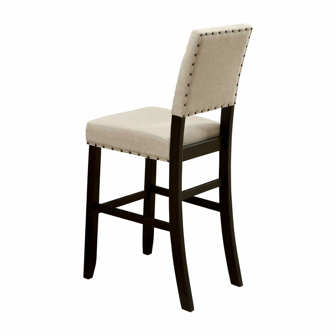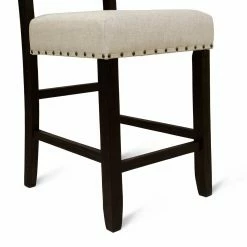 For comfortable seating with a rustic modern flair, add the Furniture of America Helin I 25 in. Counter Height Dining Chair – Set of 2 to your counter height dining table. Its open back and generous seat are upholstered in beige linen-like fabric, which is accented by dark metal nail head trim. A solid wood and veneers frame in antique black includes sturdy legs with stability stretchers that double as footrests. This set includes two counter height dining chairs.