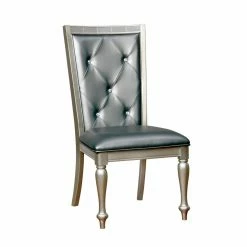 The Furniture of America Kira Contemporary Tufted Leatherette Dining Chair – Set of 2 is not only a pitch-perfect complement to the Kira Contemporary Embossed Glass Top Dining Table, but a magnificent way to add a touch of glam to any table. In fact, why not brighten up a foyer or bring a little added shine to your parlor! Every room deserves a little luxury and this two-chair set certainly delivers with its combination of bright silver rubberwood and gray faux leather upholstery accented with reflective acrylic accents. Some assembly is required.