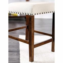 Neutral beige linen-like fabric upholstery and nailhead trim give the Furniture of America Mayly Transitional Style Counter Height Casual Dining ChairΒ – Set of 2Β its upscale casual flair. Exposed wood on this sturdy solid wood and veneers chair is finished in a burnished brown. Built-in footrests add comfort and double as stability stretchers. The chair is a chic seating solution for your breakfast counter or chat table.