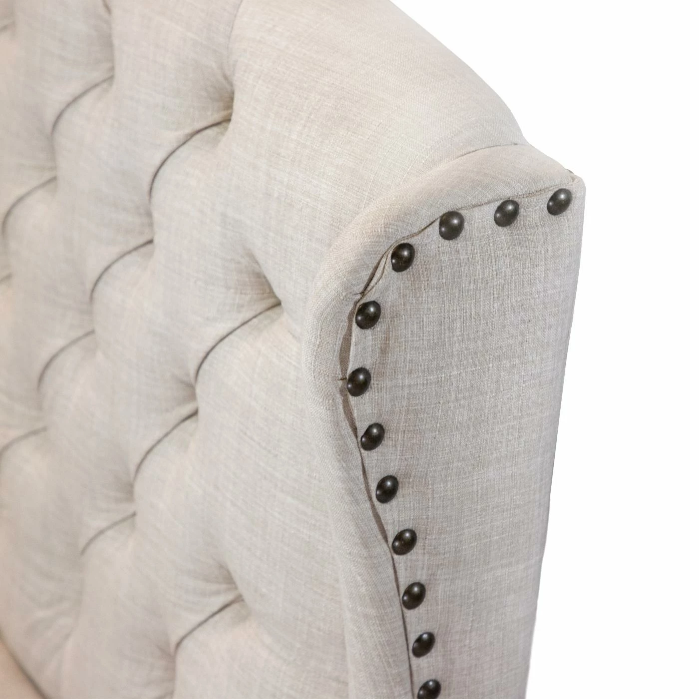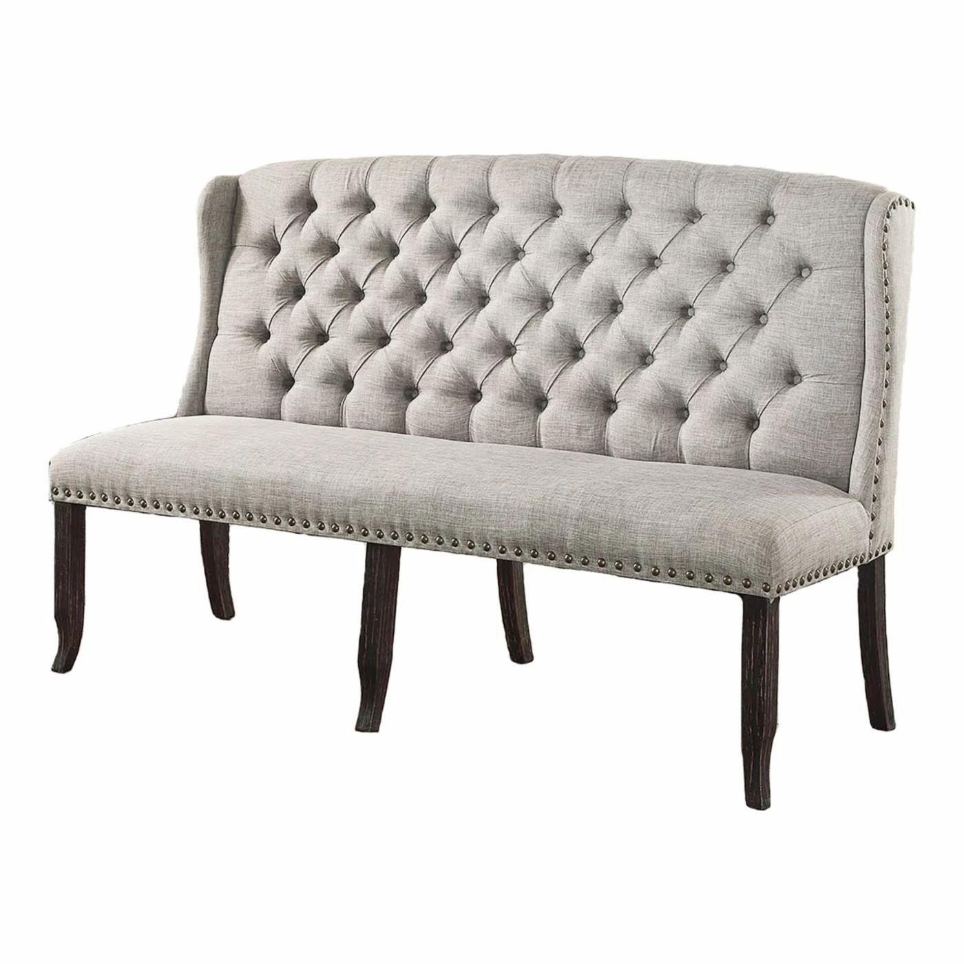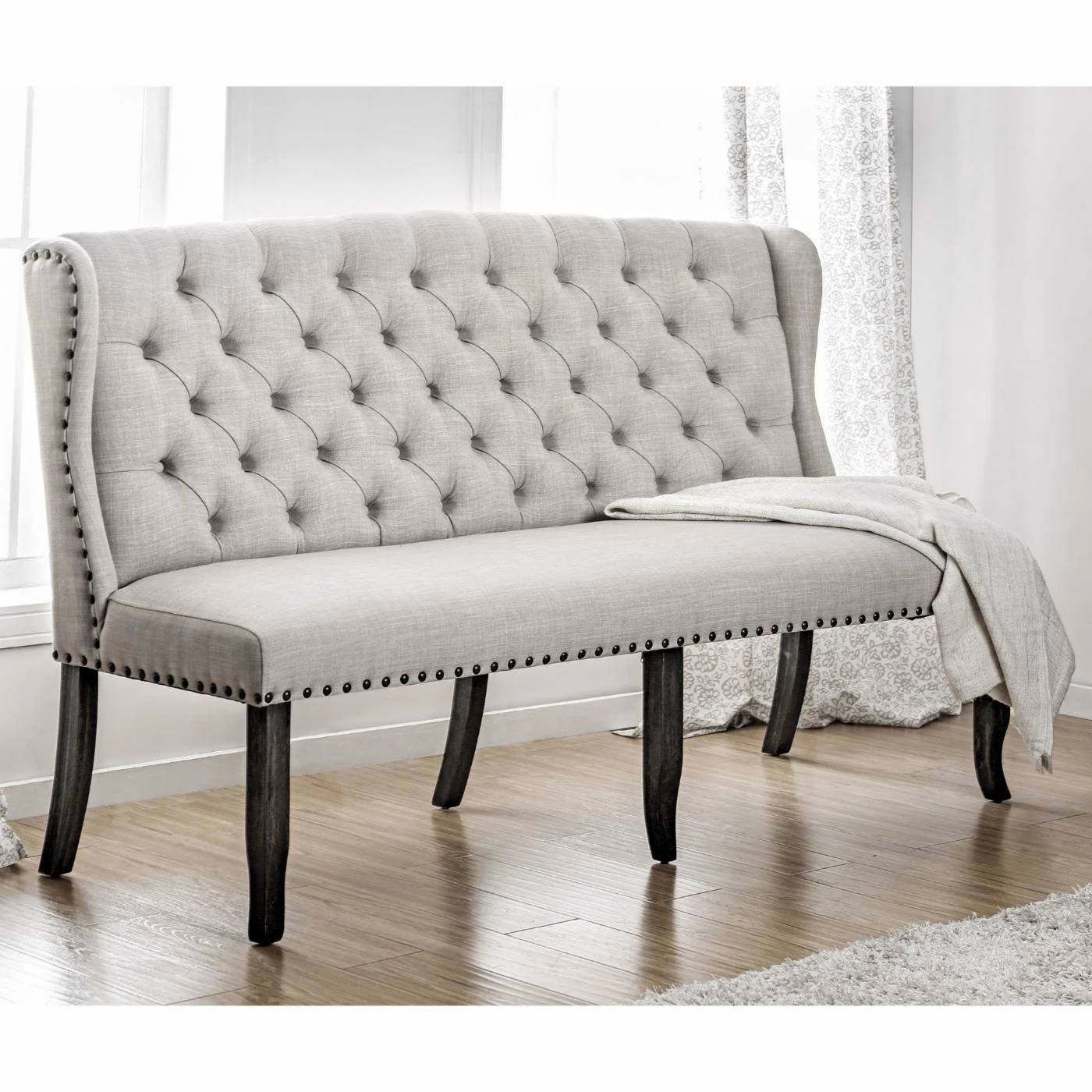 The luxurious Furniture of America Oper Rustic 3-Seater Tufted Linen-like Fabric Loveseat Dining Bench is an impressive addition to the table, but with chic styling like this youβll be tempted to place this three-seater in the living room as well. This beautiful piece fuses modern and classical elements to bring you bliss. The generously-sized wingback design is crafted using a durable rubberwood frame with thick foam fill and soft, linen-like fabric. Its tapered wood legs come in a distressed black finish while the muted hue of the upholstery is embellished with decorative accents like plush button tufting and antiqued nailhead trim. Some assembly is required.