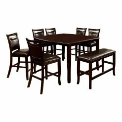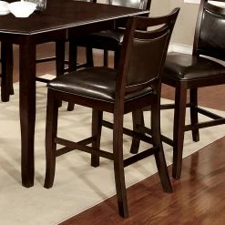 Outfit your inherited or cherished dining table with the Furniture of America Ridgeway Square Counter Height Dining Table – Set of 2 for comfortable, tall seating. This counter-height chair is perfect for kitchen island, bar tables, and tall dining tables. Its longs legs are curved slightly inward and tapered near the base. Fine solid hardwood is use to build the frame, featuring a veneer surface overlay and finished in a stunning dark espresso brown. The wide seat is padded with foam and upholstered with rich brown faux leather. The seat back is also padded and upholstered. Alone or in a set, this chair looks great in any room of your home.