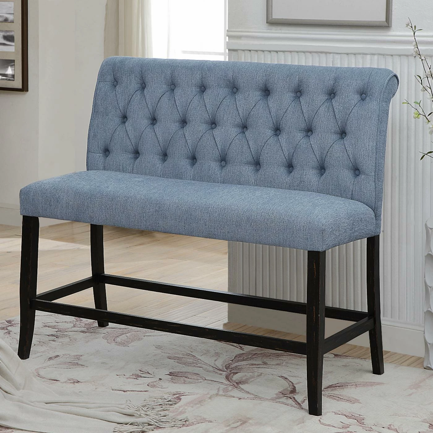 Provide your counter-height table with some handsome classical seating with the Furniture of America Verona Contemporary Chenille Counter Height 2 Seater Bench. This bench has a wide seat and rolled back that’s large enough for two people. Solid rubberwood constructs the frame, perched on dark brown block legs. The seat is padded thickly with dense foam and upholstered in fine chenille fabric. The backrest features a diamond button-tufted design. Choose from available colors.