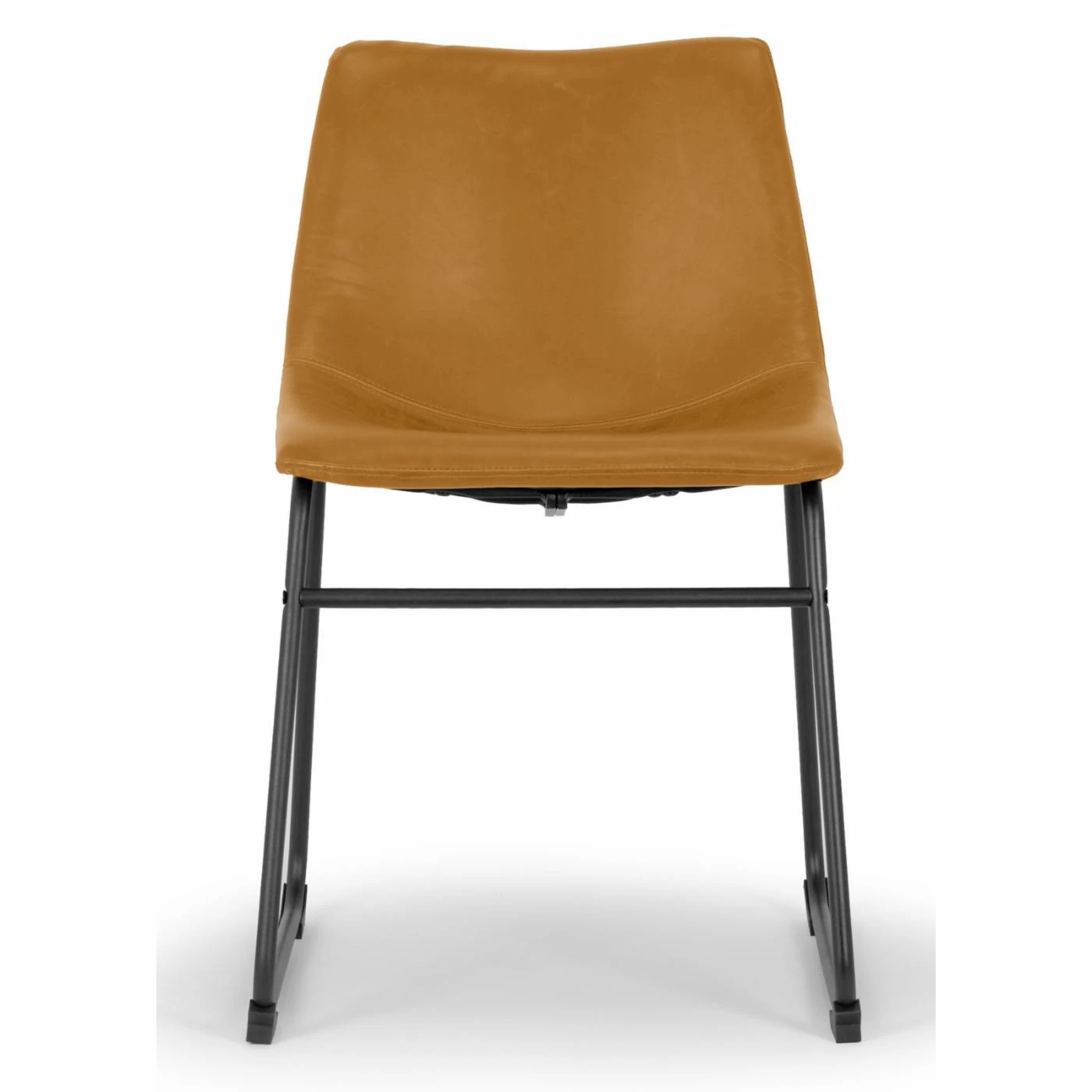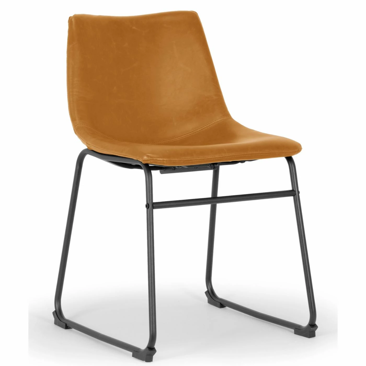 Bring retro styling into your modern dining room with the Glamour Home Adan Upholstered Dining Side Chair – Set of 2. The neutral cappuccino brown color of these chairs coordinates with a wide variety of color schemes. Each seat is curved for optimal comfort and covered in a faux leather that is easy to clean. A black iron frame ensures stability and durability, while floor protectors keep your floors scuff-free.