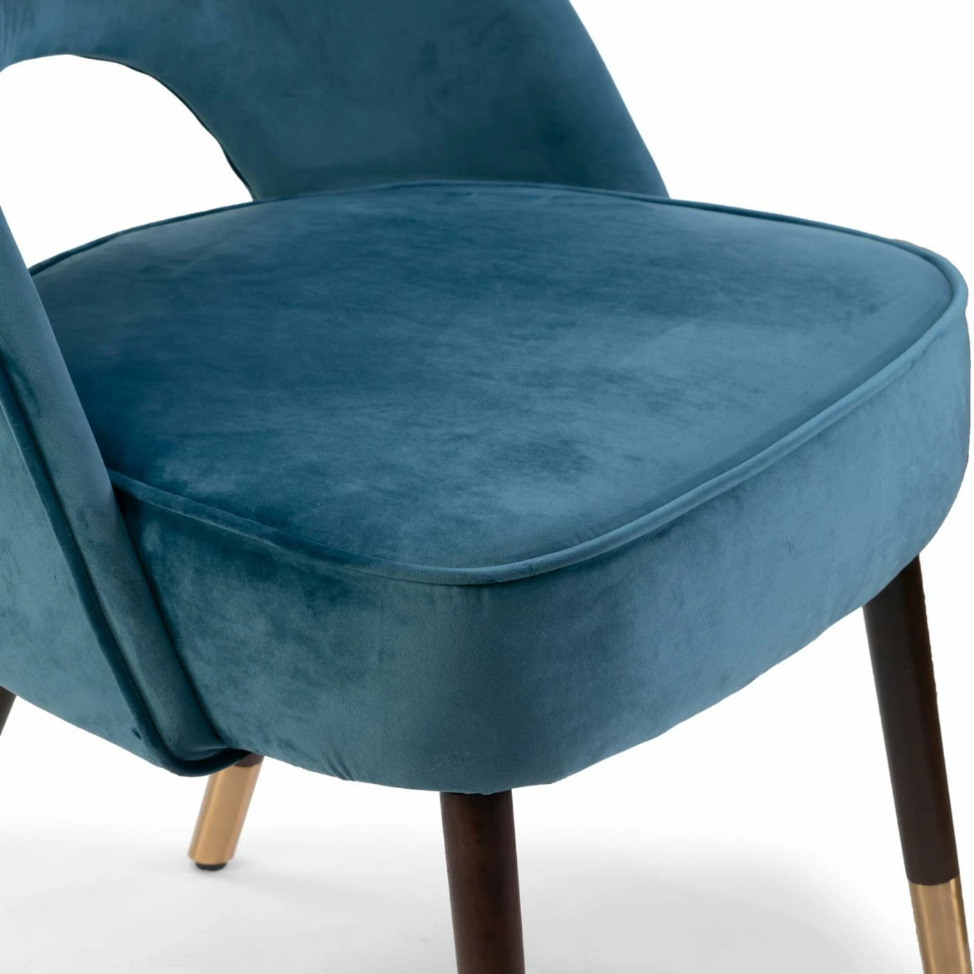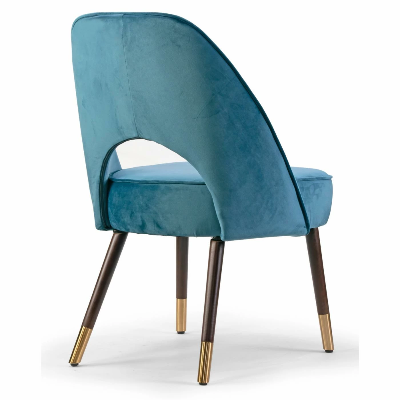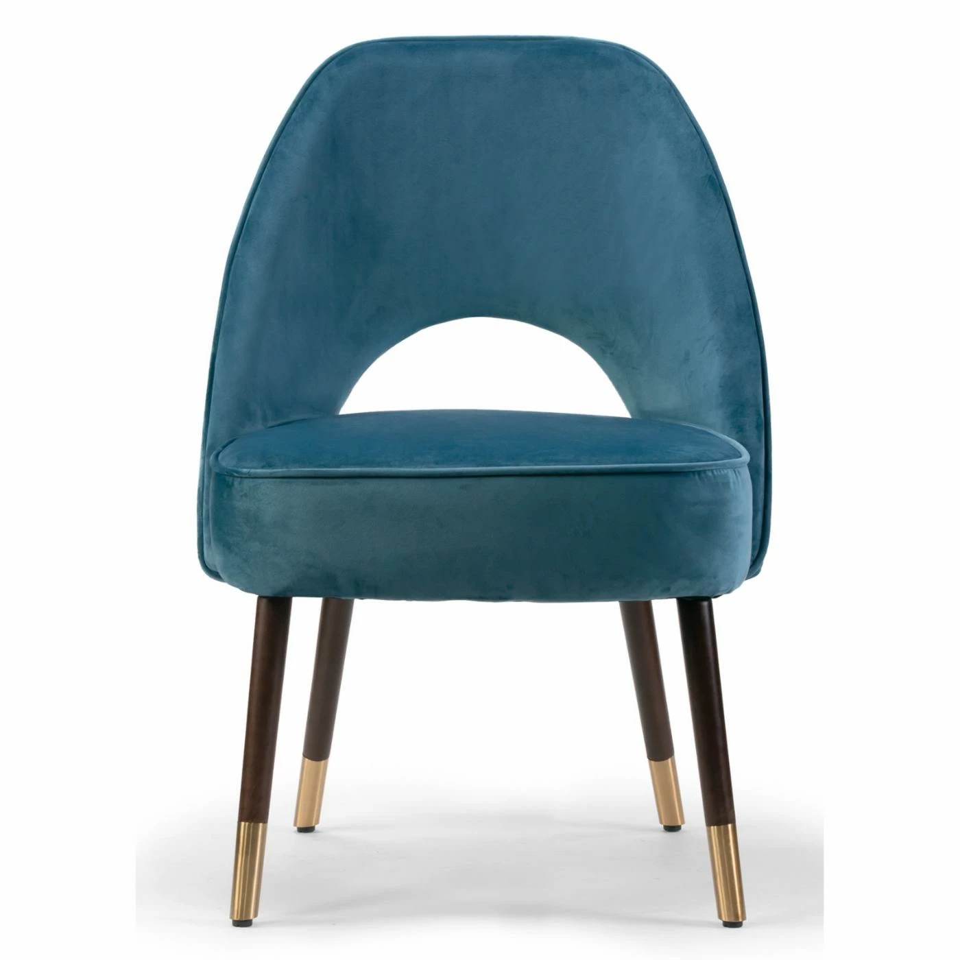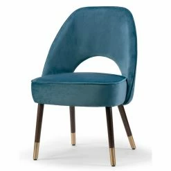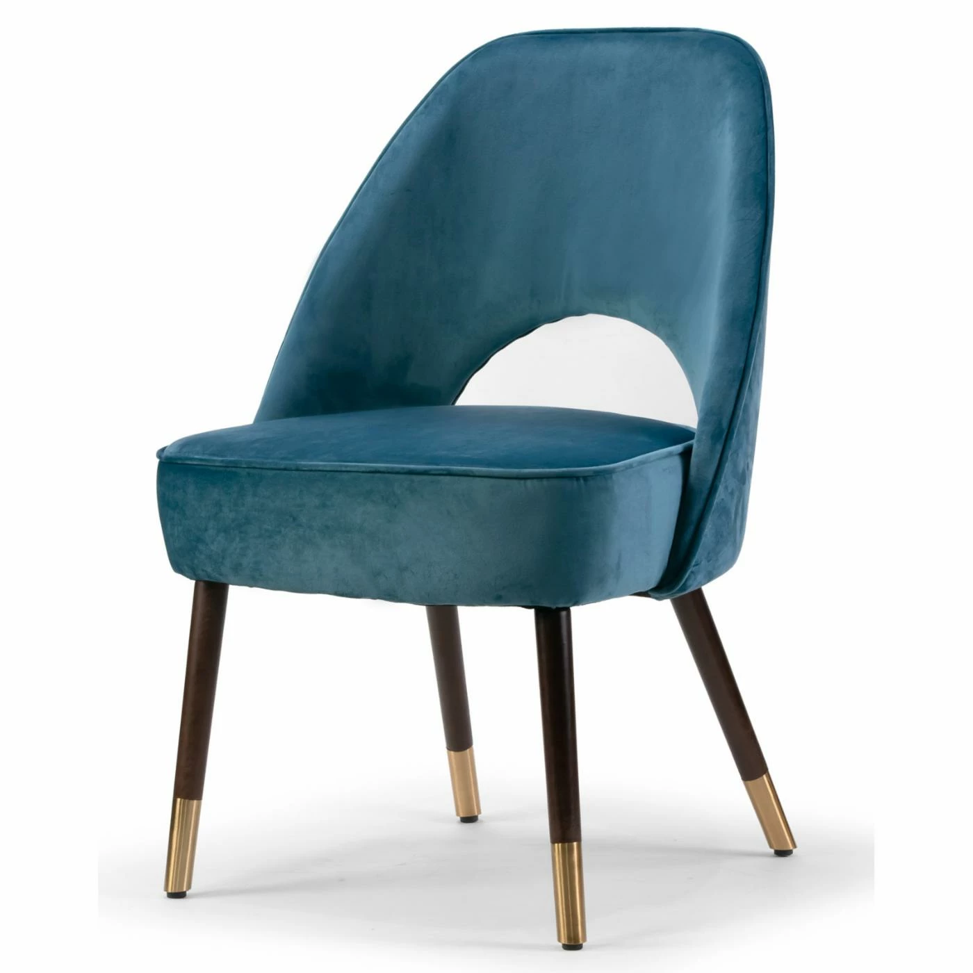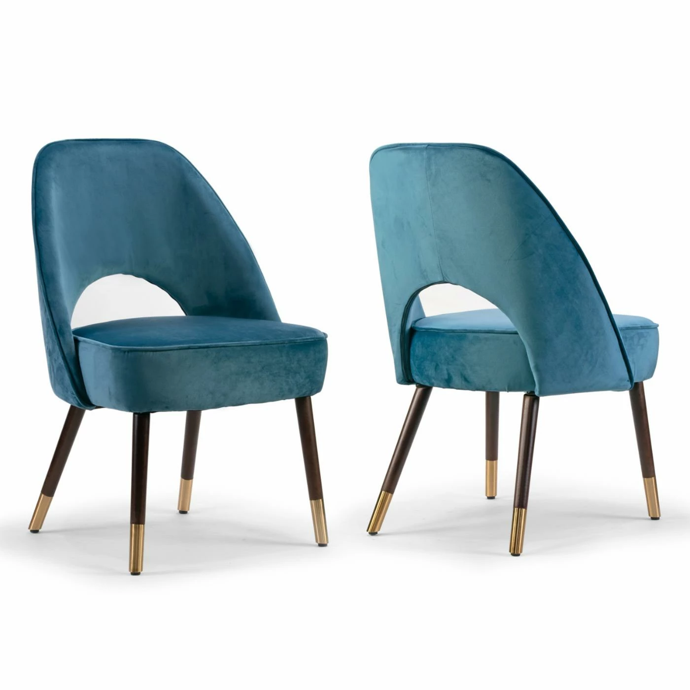 Velvet and metal leg caps give the Glamour Home Amber Mid-Century Modern Dining Side Chair – Set of 2 its glam mid-mod appeal. Sure to dress up your dining room, this set includes two keyhole side chairs that are outfitted in blue velvet upholstery. They sit on flared wood dowel legs in black with bright gold ferrules. Welted trim adds a tailored touch to these two dining side chairs.