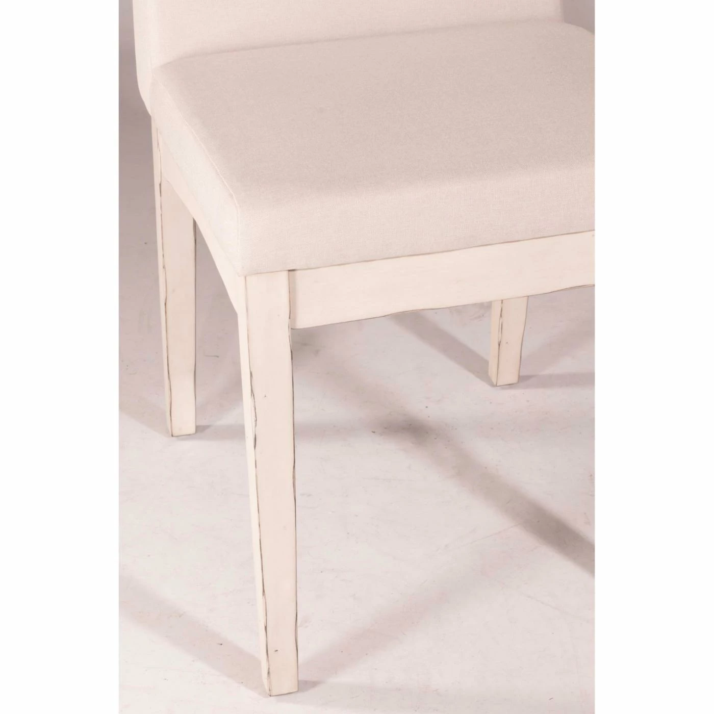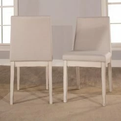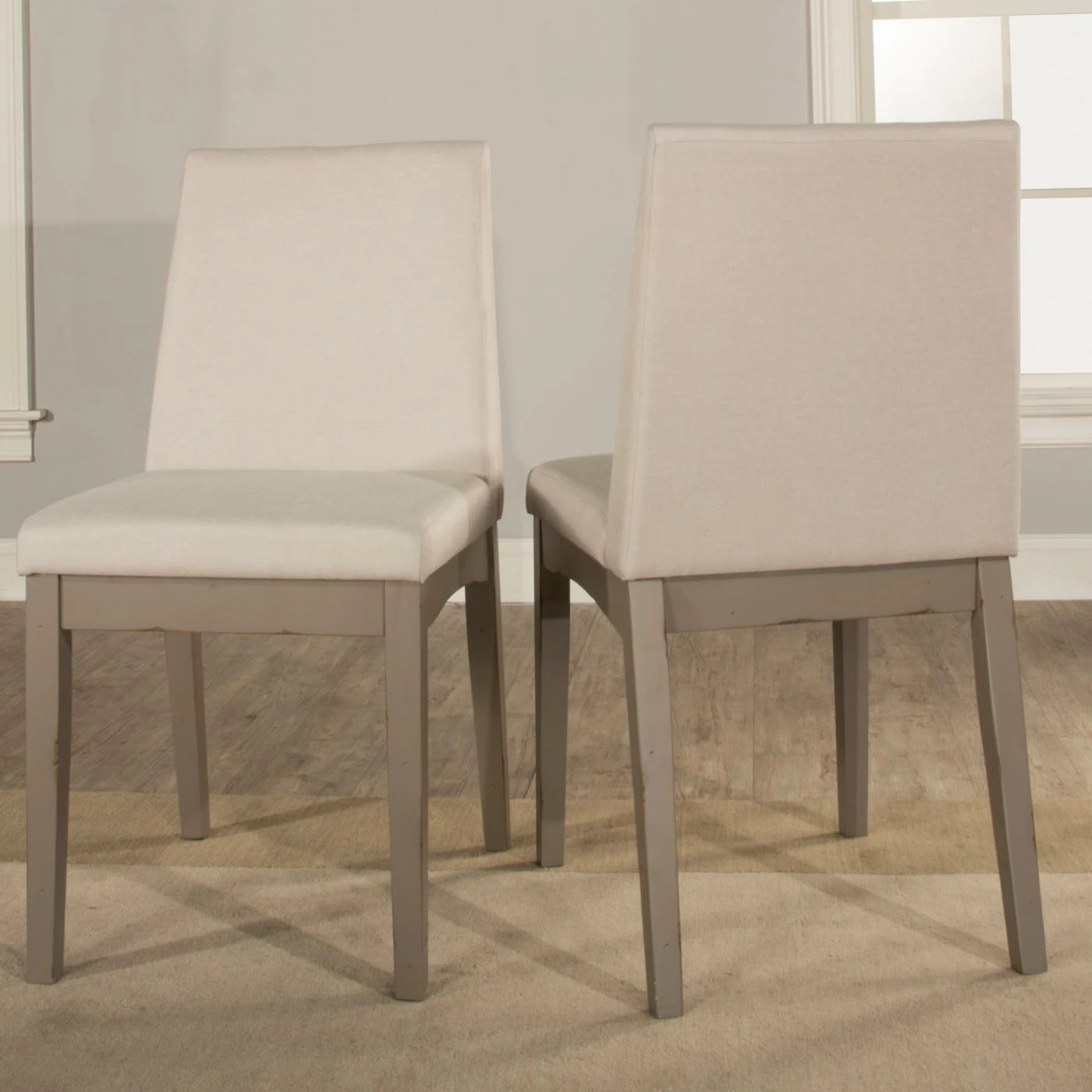 The classic parson chair is updated in the Hillsdale Clarion Upholstered Dining Chair – Set of 2. Neutral fog fabric upholstery graces the simple backrest and generous seat of this dining chair. Tapered rubberwood legs in a painted distressed gray provide a friendly contrast. This set includes two dining side chairs.