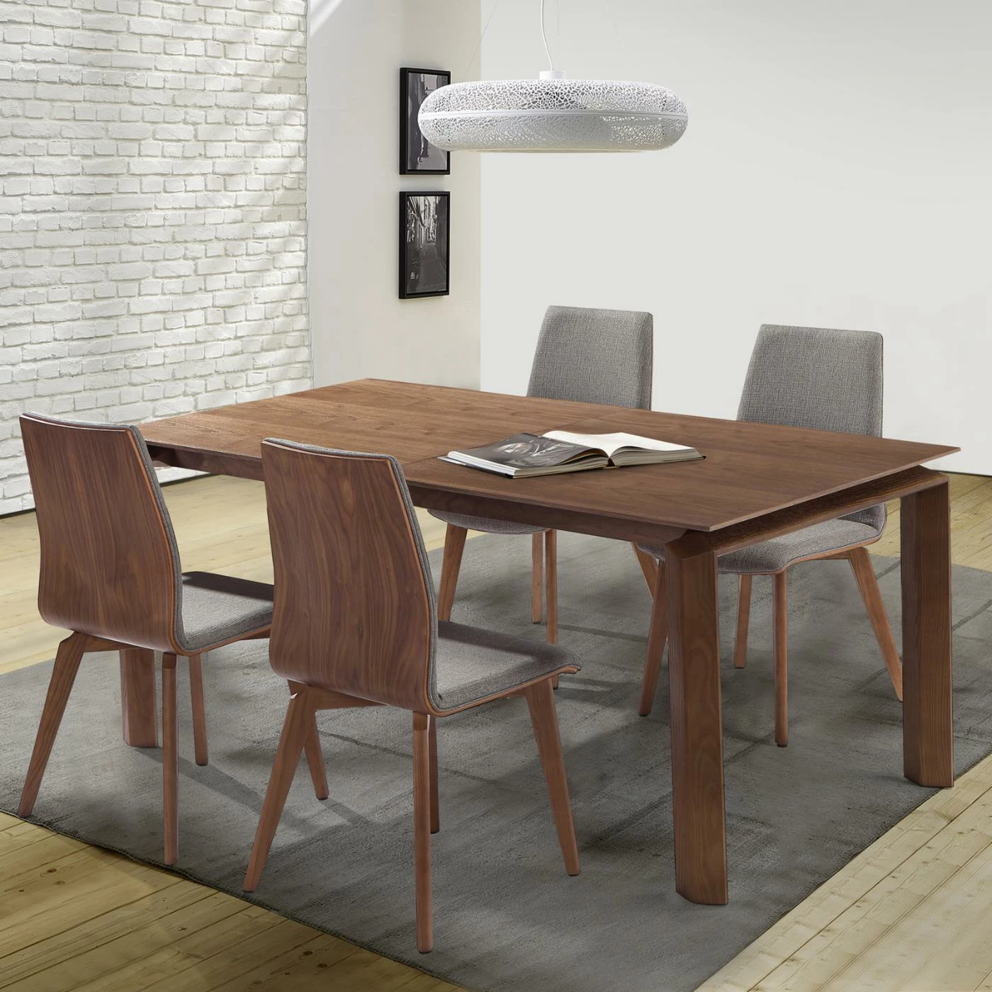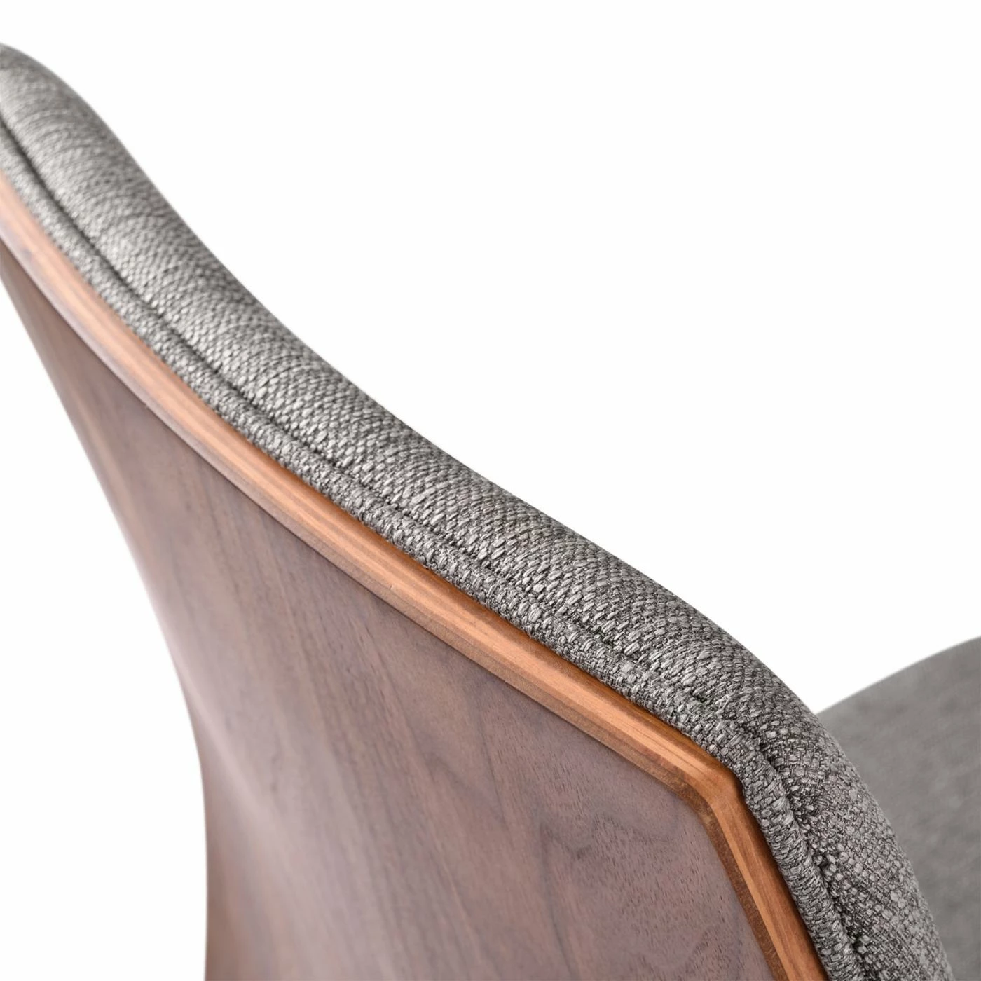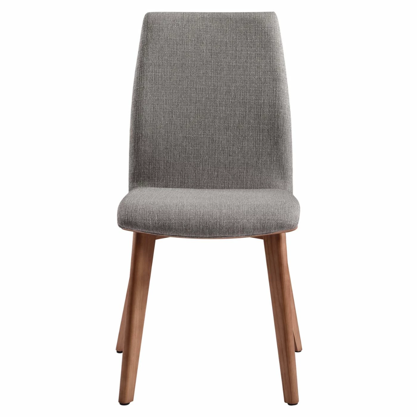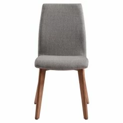Spice up your dining room with the Home Chic Granada Upholstered Dining Chair – Set of 2 for some sharp, mid-century inspired accents. Two matching, armless side chairs are included. Each chair is built from wood with splayed, tapered legs and a contoured, solid wood backrest. The foam-padded seats and backrests offer comfort for all your casual and formal meals. A stain-resistant, soft gray fabric upholsters the chairs and the frames are finished in deep walnut brown.