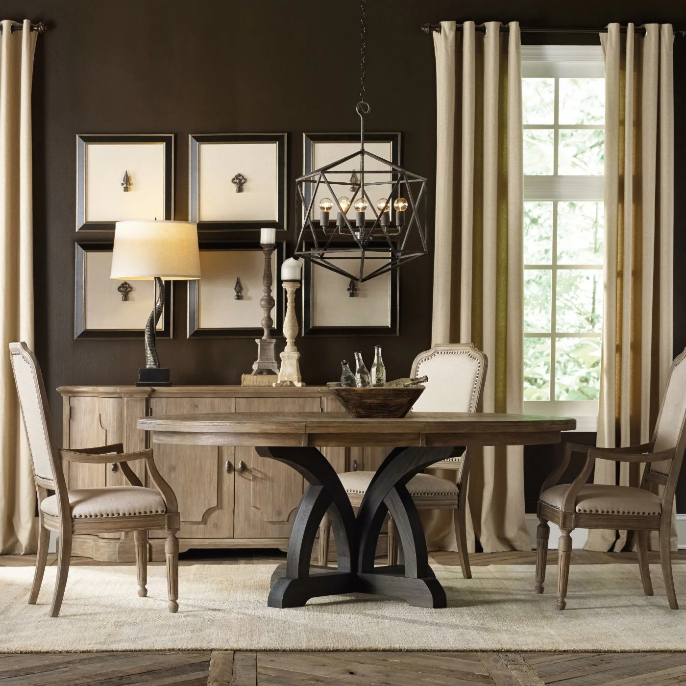 Seat guests in style and comfort with the Hooker Furniture Corsica Upholstered Dining Side Chair – Set of 2. This set includes two matching side chairs made of Acacia solids and select wood veneers in select wire-brushed artisan finish options. Architectural backs and seats are upholstered in beige fabric with nailhead trim. Turned, fluted front legs and flared back legs offer stylish support.