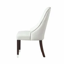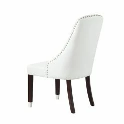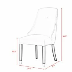 Sit with style in the Inspired Home Jensen Metal Tip Leg Dining Side Chair – Set of 2. The durable plywood frame keeps the distinctive shape of these seats, and the exposed wood legs are capped with coordinating metal in the front. A single button tuft detail adds a touch of elegance to these chairs. The chrome nailhead trim is handmade and brings a bespoke vibe to the upholstery. Choose from available color options to best match your home. The armless design of these chairs means that you’ll be able to easily store them beneath tables or in corners as functional accents. Some assembly required.