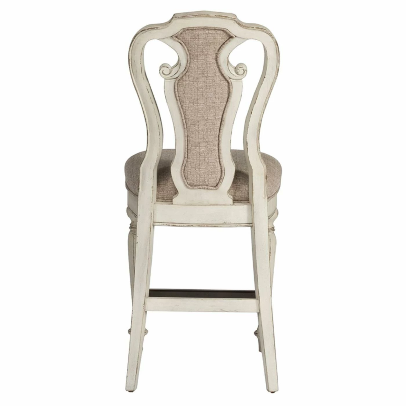 Elevate your casual dining space by offering the Liberty Furniture Industries Magnolia Manor Counter Height Dining Chair. For elegance and comfort, the curvy splat back and generous seat of this dining chair are upholstered in ivory tweed chenille. An antique white finish enhances each detail of the back and turned legs. This dining chair is designed to accommodate your counter height gathering table.