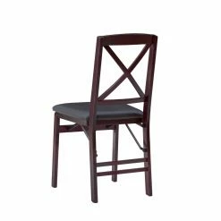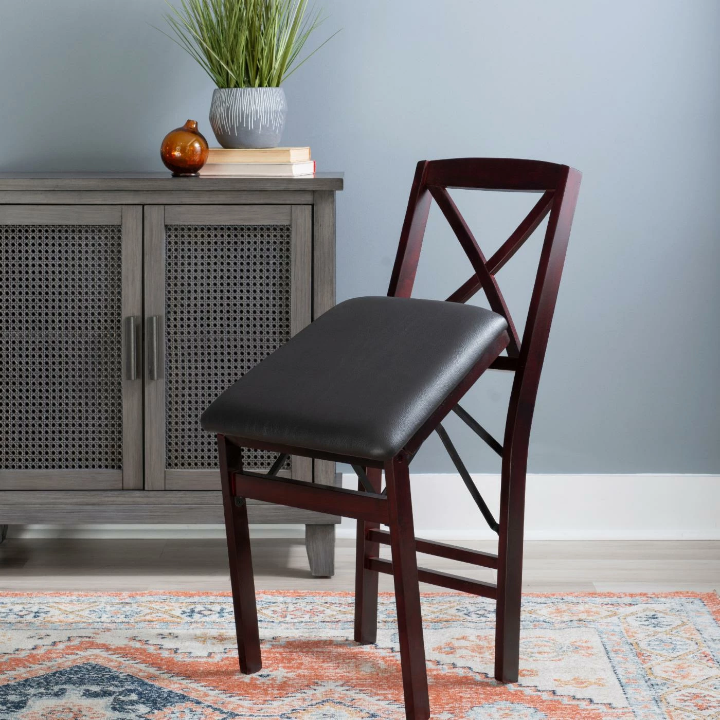 The Linon Tremont X-Back Folding Dining Chair gives you the style of classic furniture combined with the ease and convenience of a folding chair. This set includes two matching chairs, each made from solid wood with a rich Espresso finish. The chair backs have an X design. Seats are padded and covered in dark brown leather-look PVC vinyl, which wipes clean easily. These chairs also feature front and rear supports for extra stability. When not in use, they fold flat for super-easy transport and storage. Each chair measures 17W x 20D x 35.5H inches (17W x 7D x 37H inches when folded), and has a seat height of 18 inches.