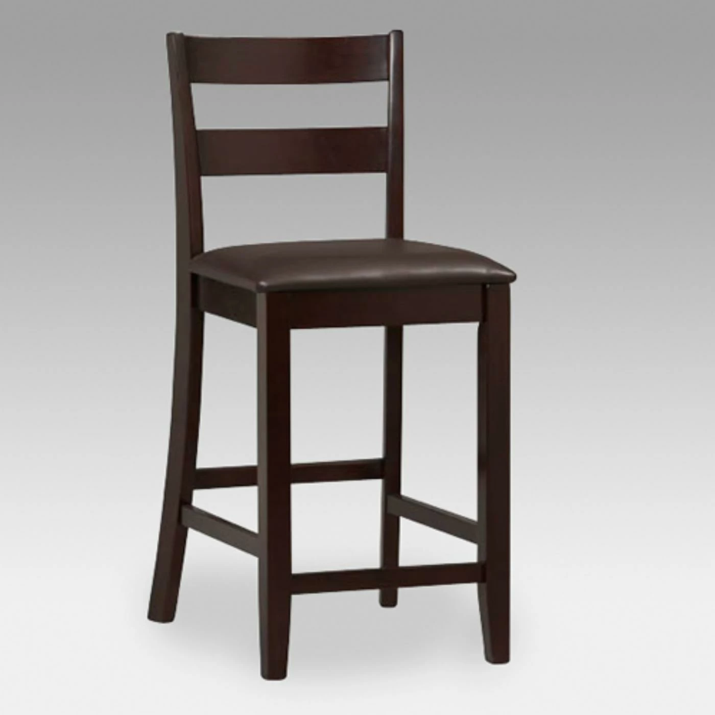 The Linon 24 Inch Fayette Counter Stool is simply perfect: clean, traditional lines and subtle good looks. The rich espresso finish and slat-back Mission styling blend beautifully in casual or formal settings. This comfortable counter-height stool has strong wood construction and a dark brown, wipe-clean vinyl padded seat for extra comfort. Backed by a one year manufacturer’s warranty. Assembles easily. Please note: This item is not intended for commercial use. Warranty applies to residential use only.